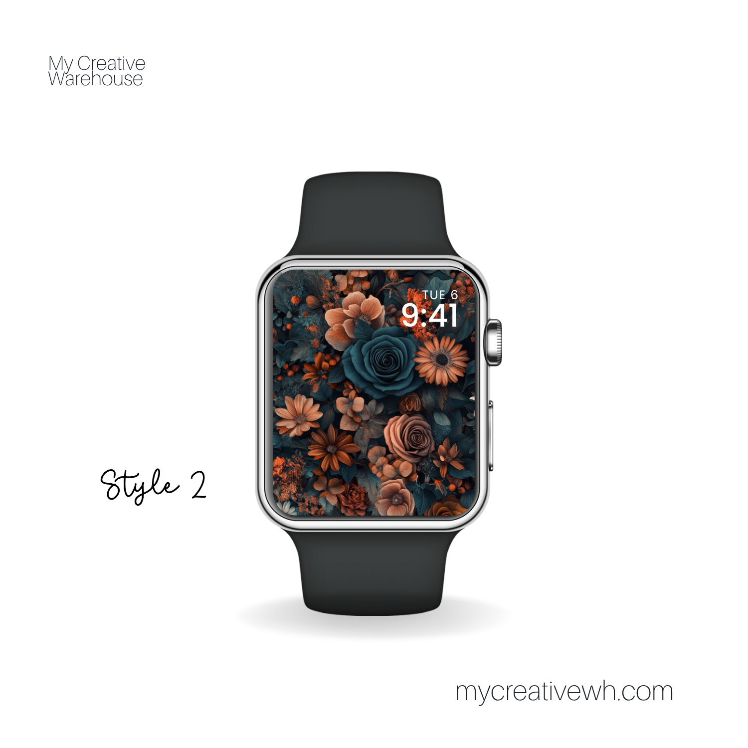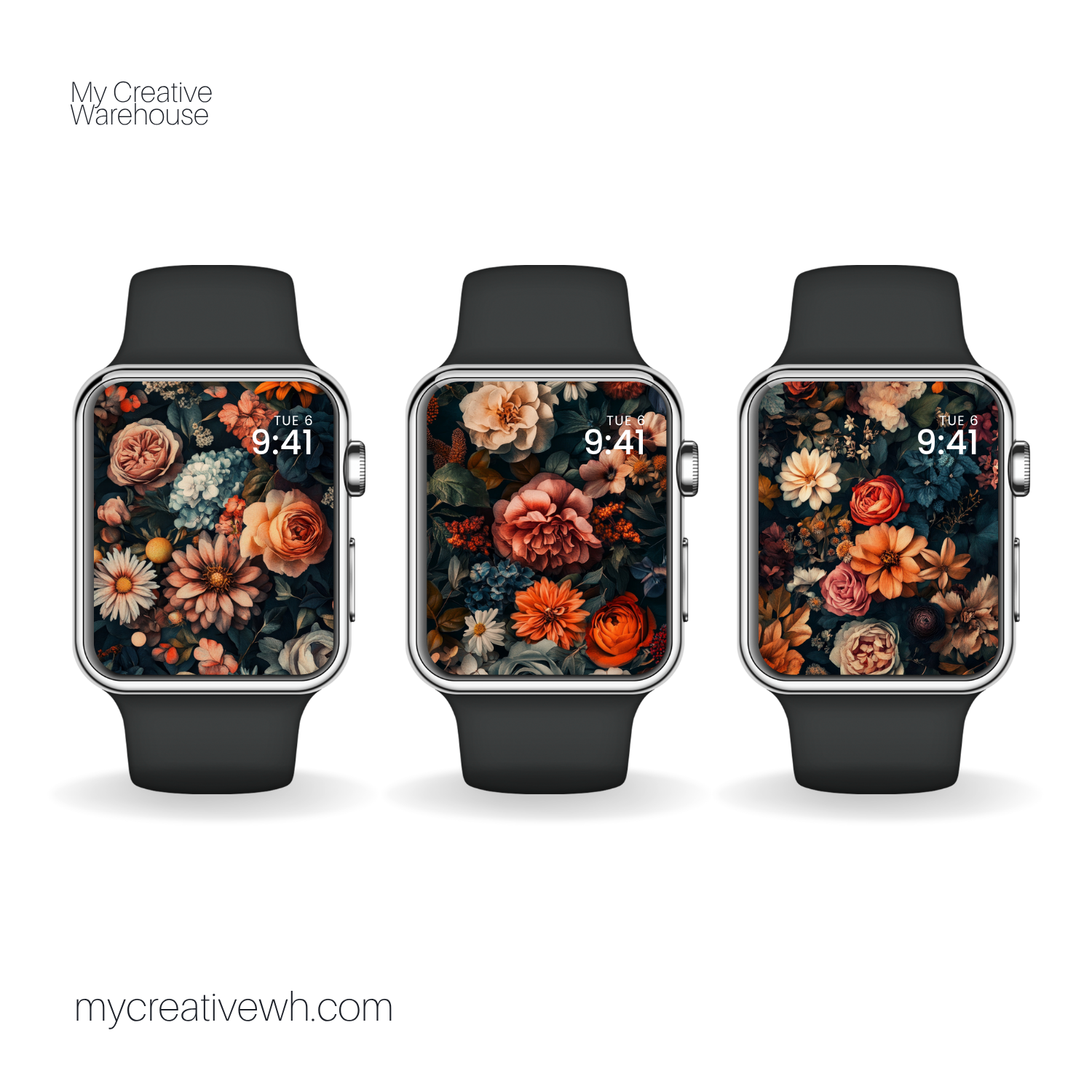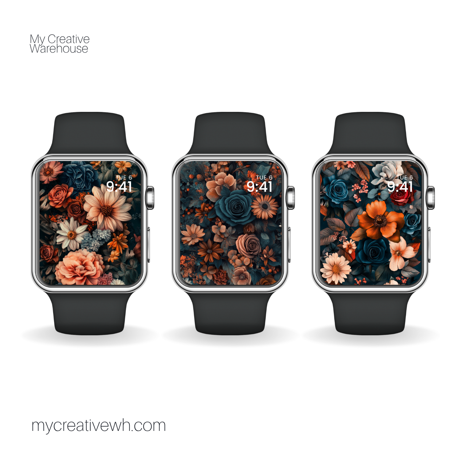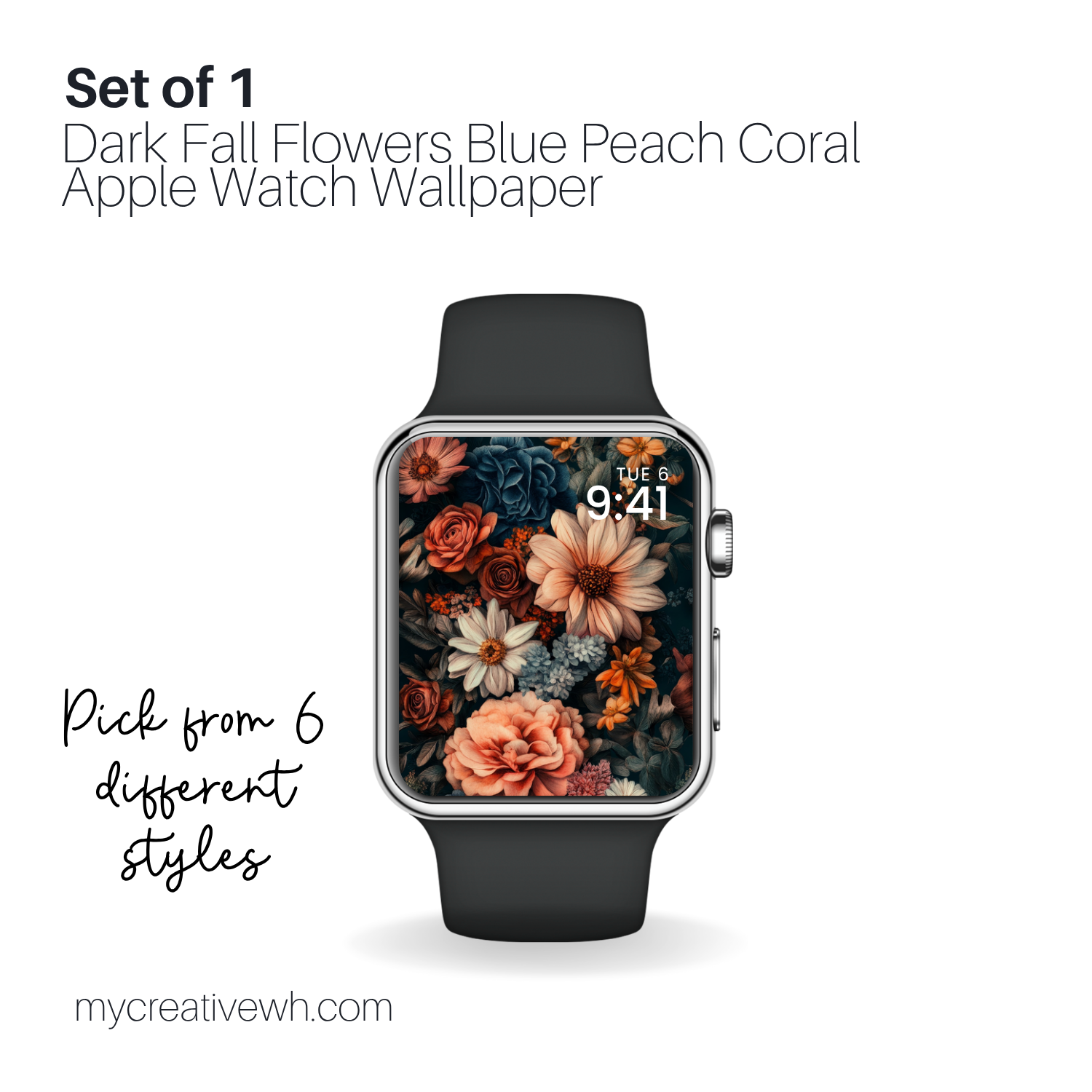 Adorn your wrist with the haunting beauty of autumn using the Dark Fall Flowers Blue Peach Coral Apple Watch Wallpaper. These 6 high-resolution designs miniaturize lush floral bouquets—peonies, ivy, and roses—into compact, floral scenes of navy blue, terracotta, and slate blue. Subtle peach and coral accents mimic the glow of twilight, while intricate petal textures retain their detail even on the smallest screen.