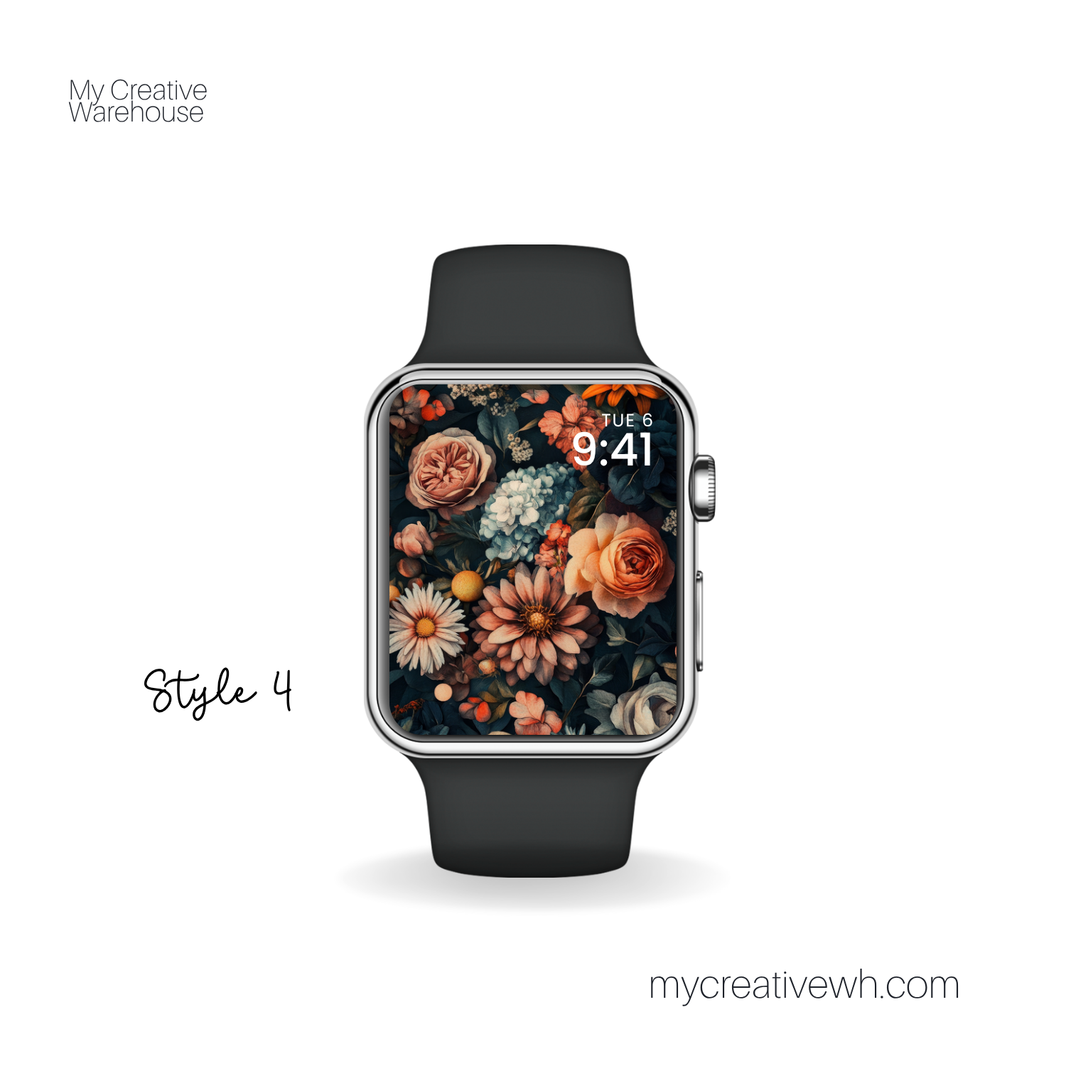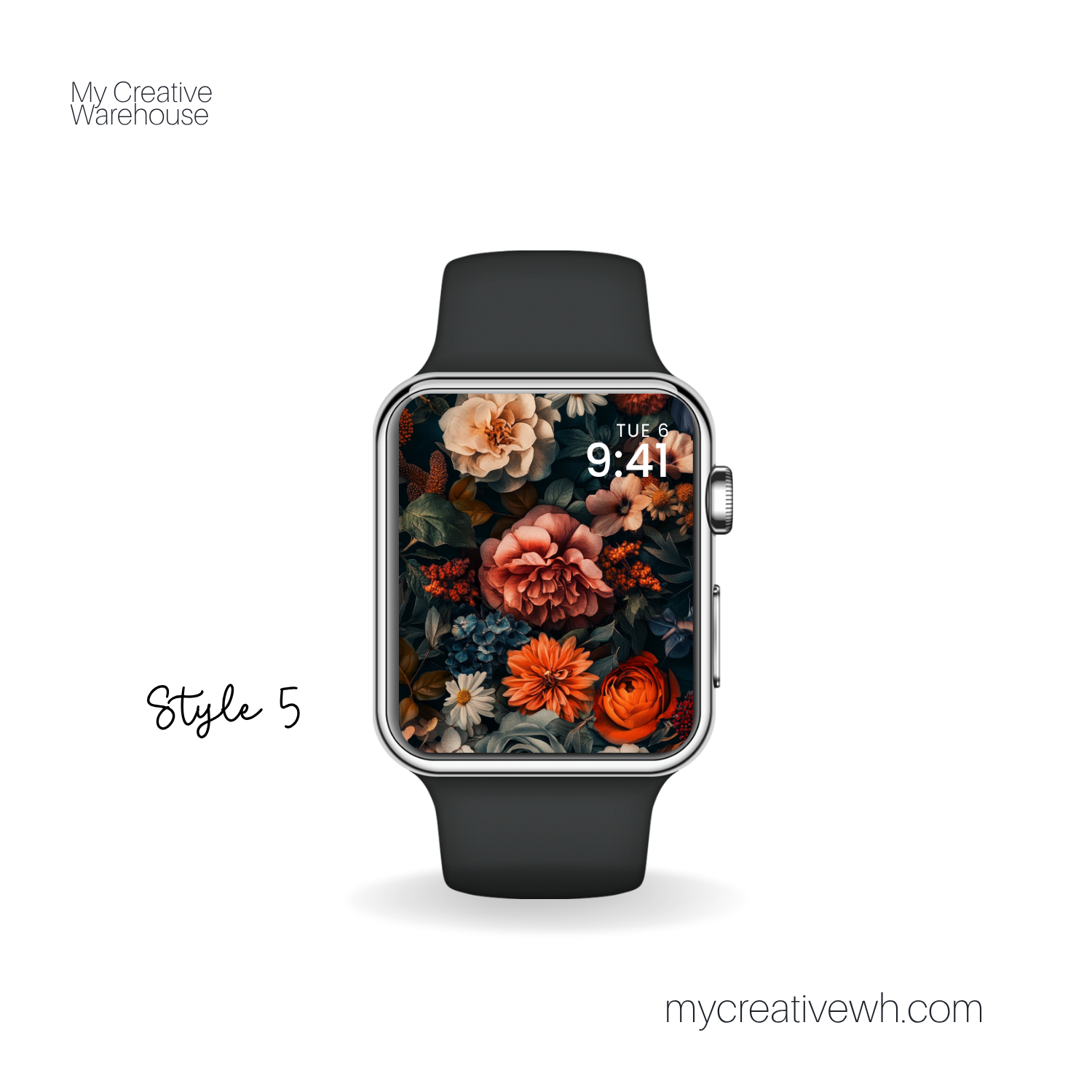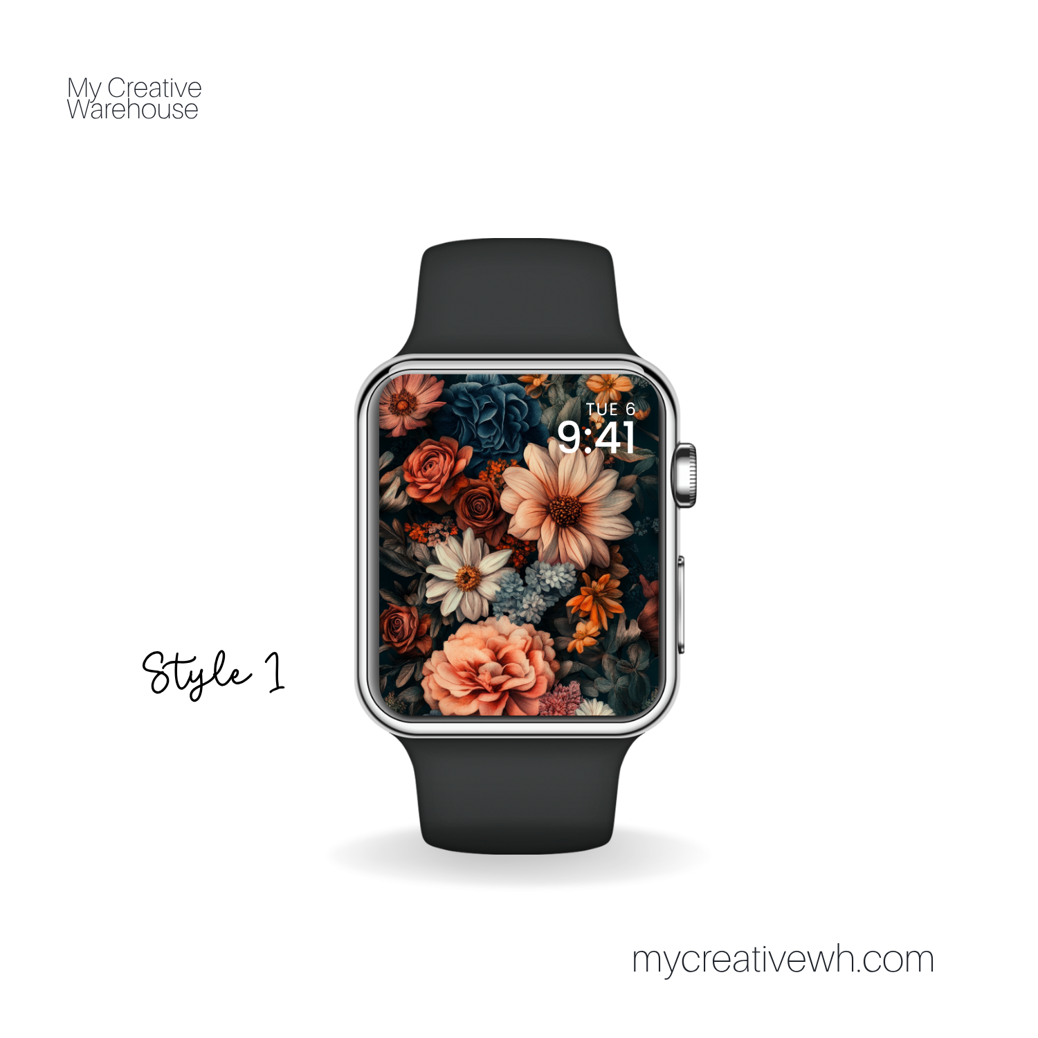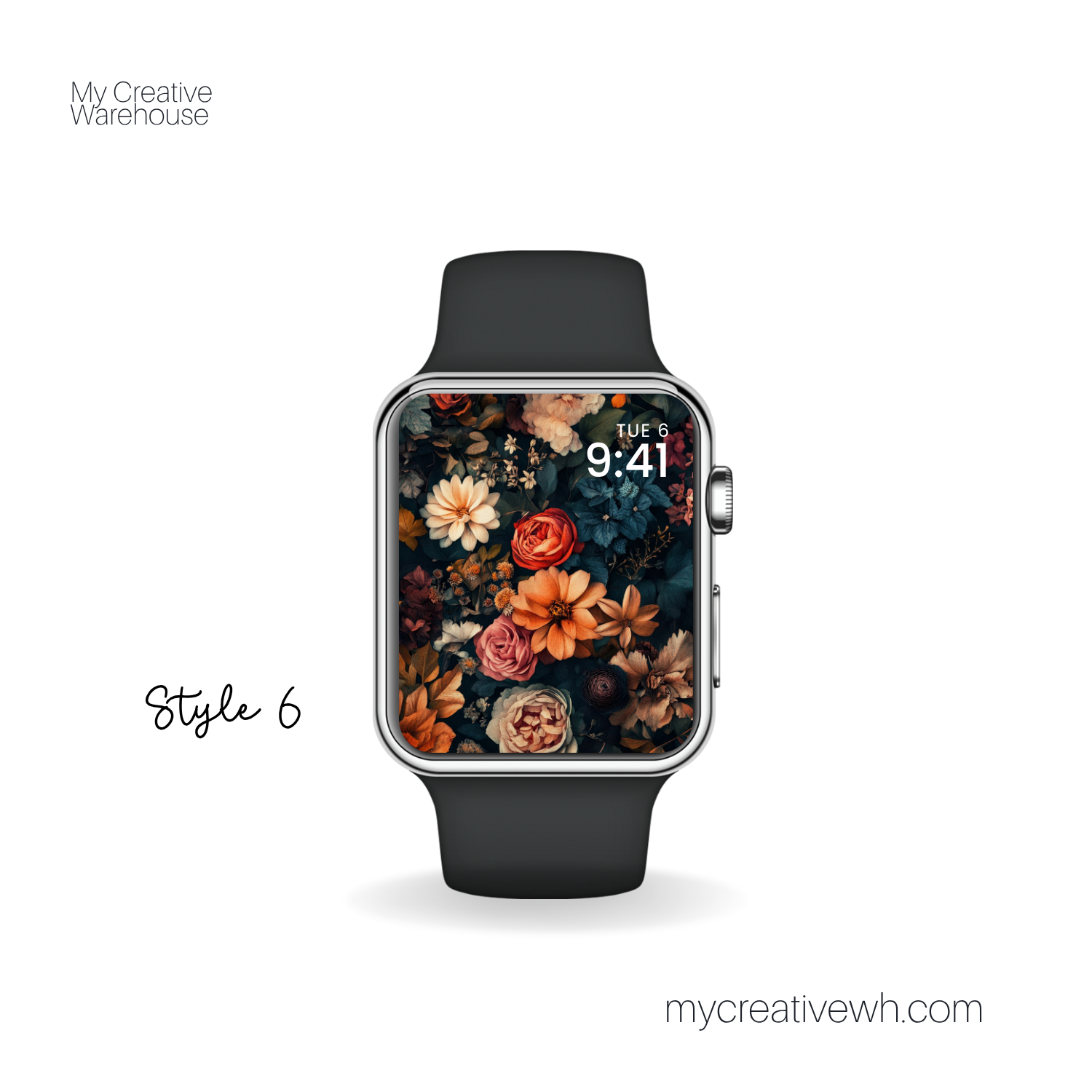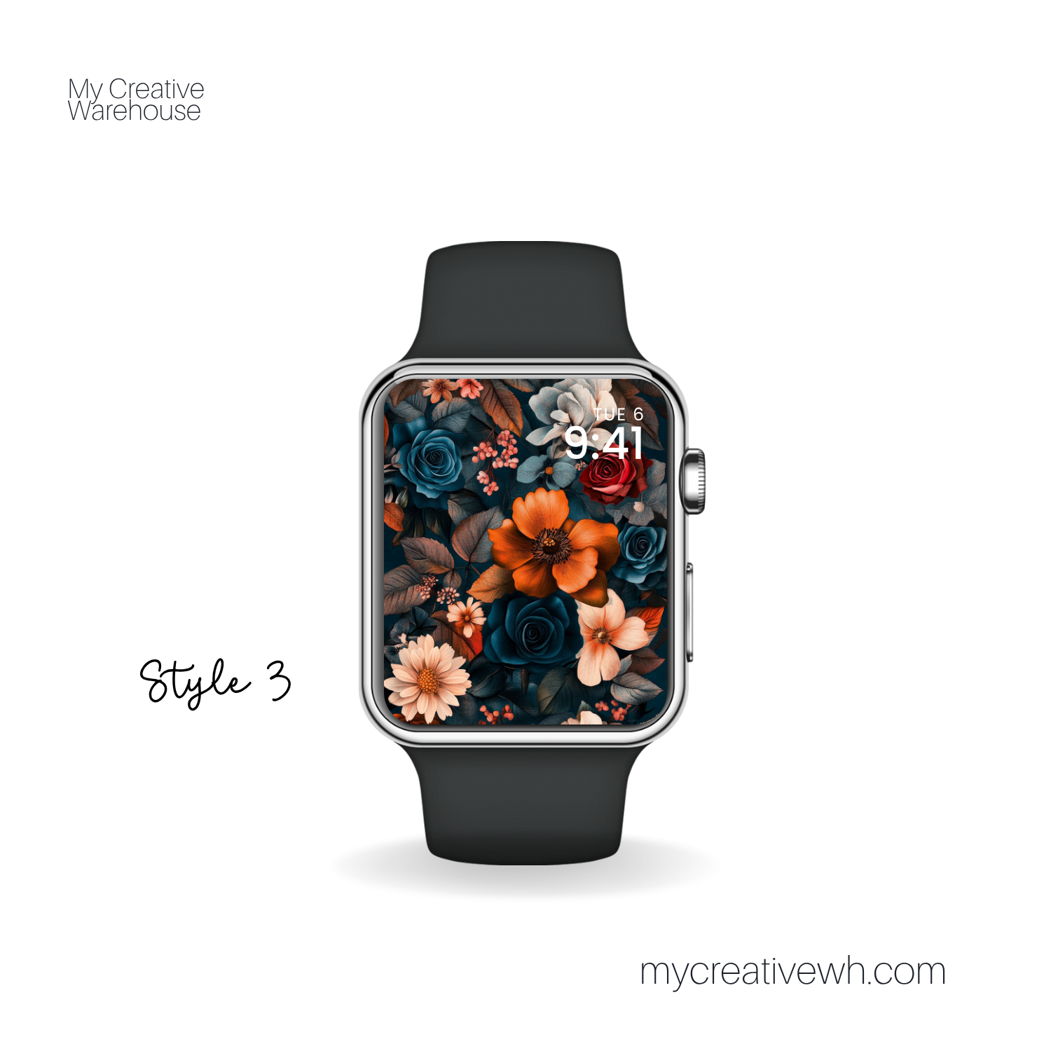 Adorn your wrist with the haunting beauty of autumn using the Dark Fall Flowers Blue Peach Coral Apple Watch Wallpaper. These 6 high-resolution designs miniaturize lush floral bouquets—peonies, ivy, and roses—into compact, floral scenes of navy blue, terracotta, and slate blue. Subtle peach and coral accents mimic the glow of twilight, while intricate petal textures retain their detail even on the smallest screen.