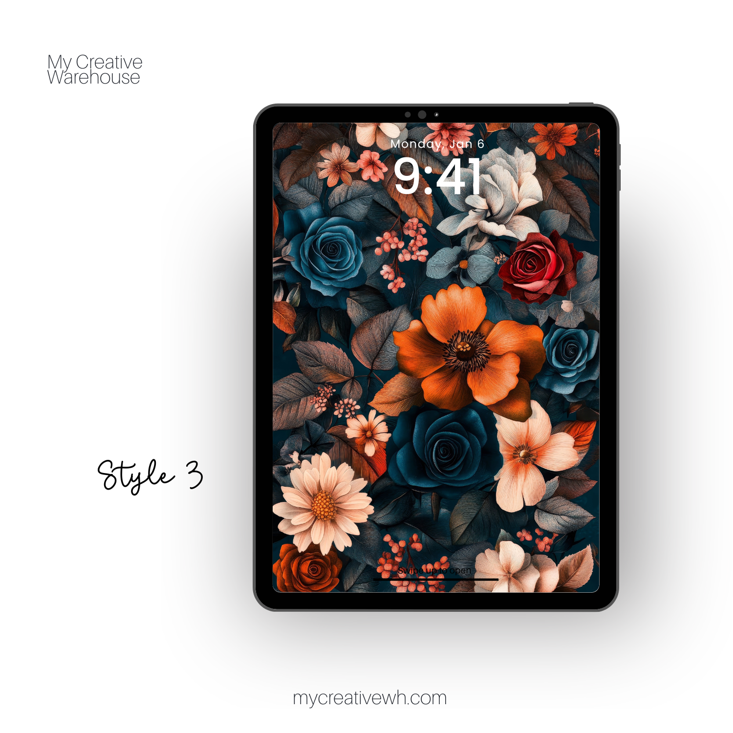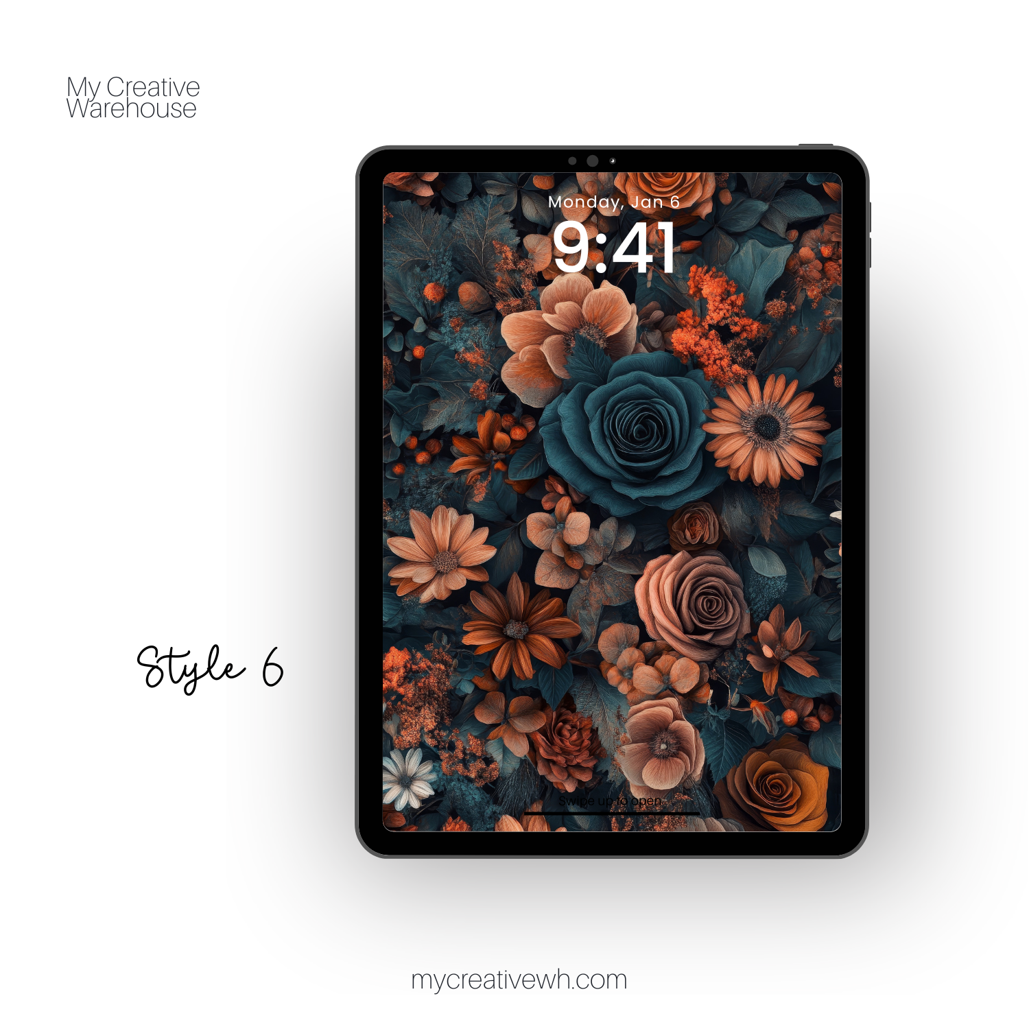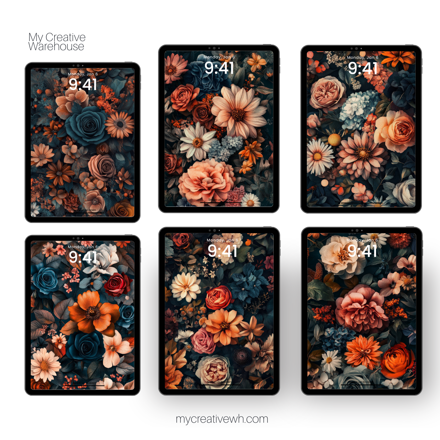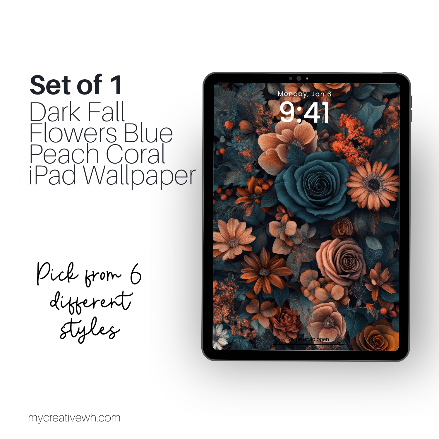 Transform your iPad into a canvas of autumnal elegance with the Dark Fall Flowers Blue Peach Coral iPad Wallpaper. This collection of 6 high-resolution designs envelops your screen in lush, intricately detailed floral arrangements—peonies, roses, daisies, and ivy—set against a moody backdrop of navy blue, terracotta, and slate blue. The expansive display showcases velvety petals and trailing foliage with cinematic depth, perfect for artists, planners, or anyone seeking a touch of seasonal sophistication.