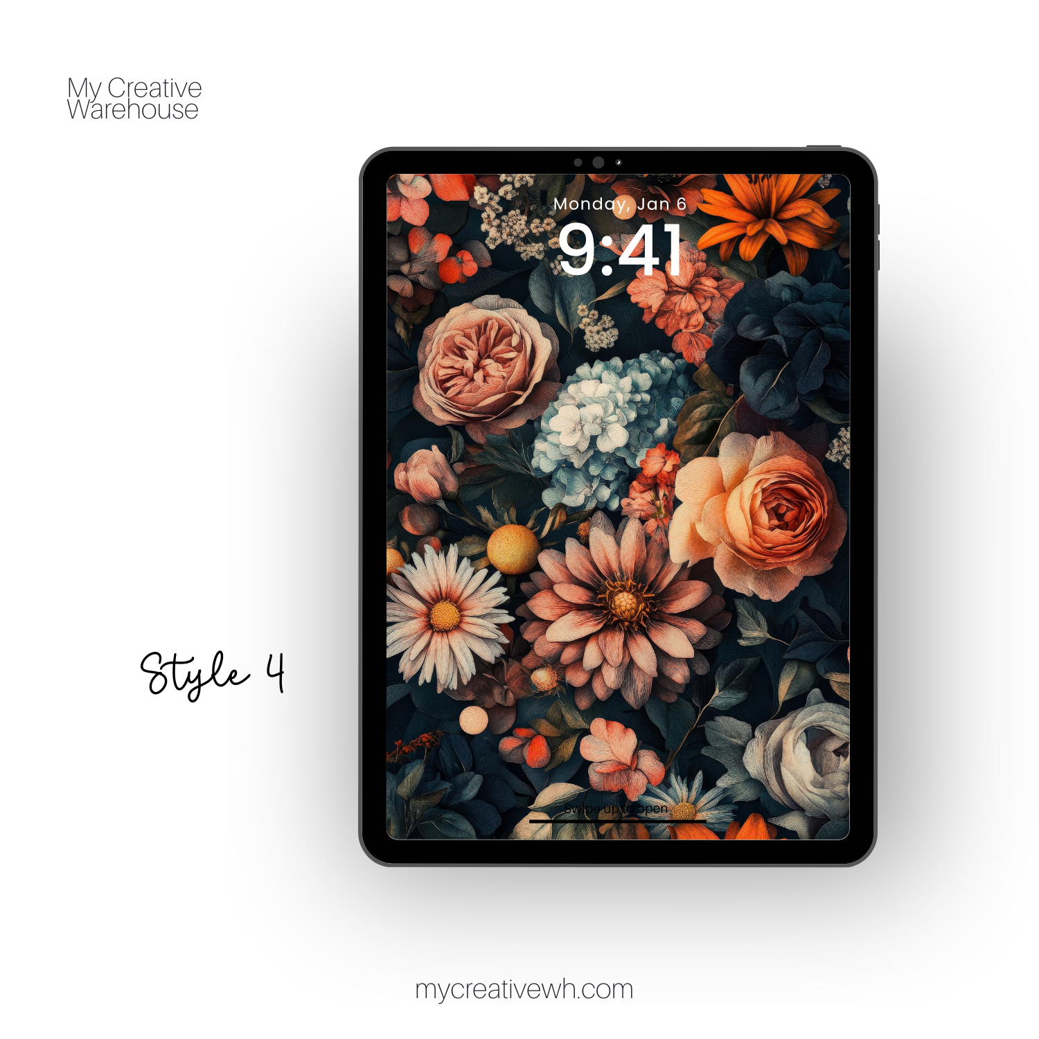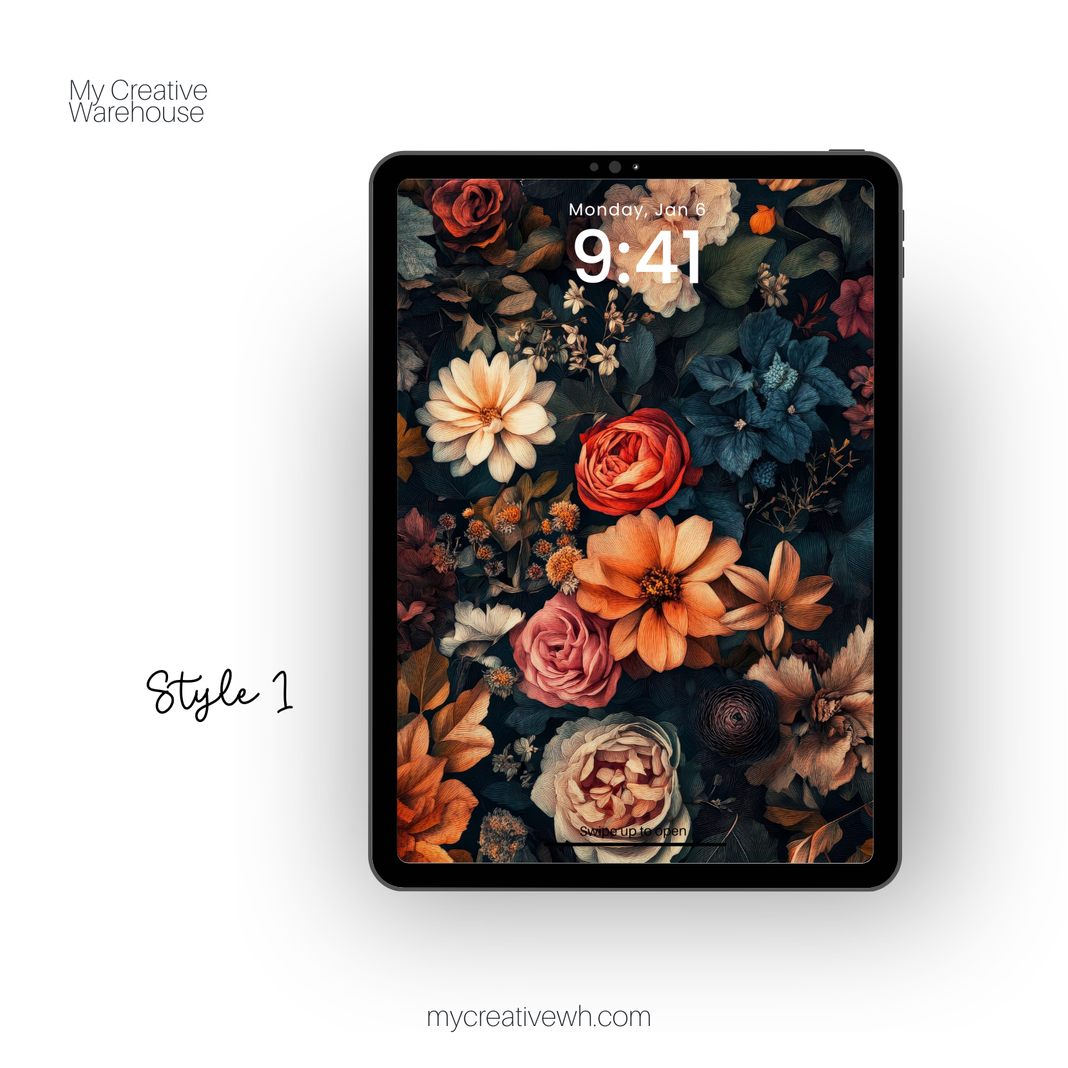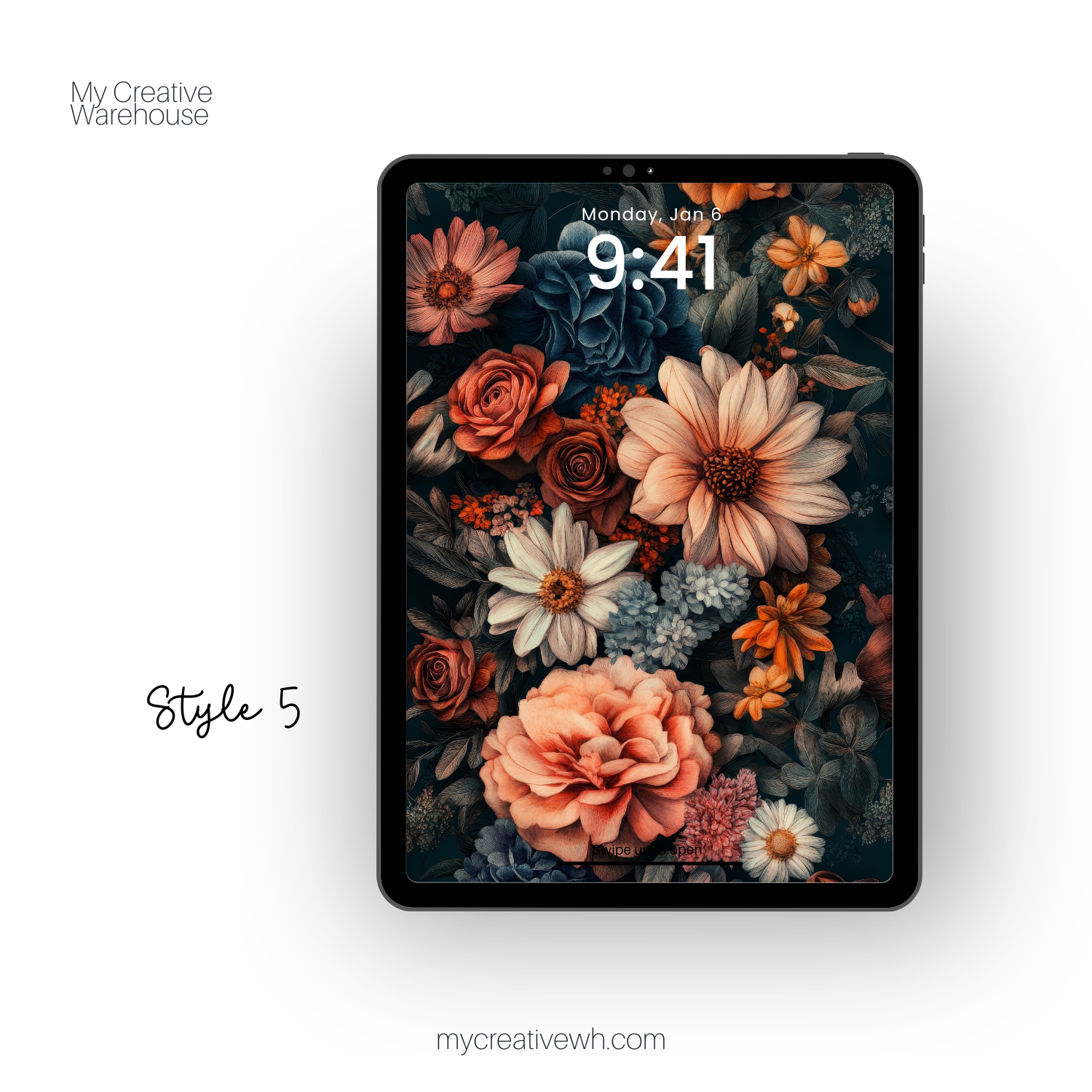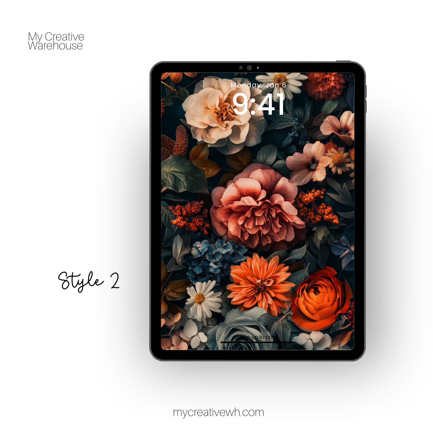 Transform your iPad into a canvas of autumnal elegance with the Dark Fall Flowers Blue Peach Coral iPad Wallpaper. This collection of 6 high-resolution designs envelops your screen in lush, intricately detailed floral arrangements—peonies, roses, daisies, and ivy—set against a moody backdrop of navy blue, terracotta, and slate blue. The expansive display showcases velvety petals and trailing foliage with cinematic depth, perfect for artists, planners, or anyone seeking a touch of seasonal sophistication.