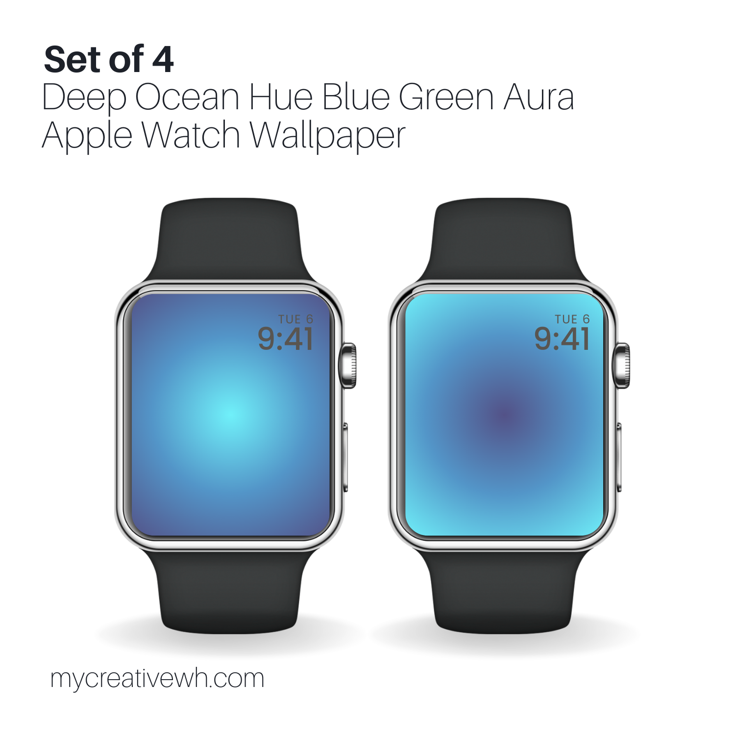 Adorn your wrist with the subtle elegance of the Deep Ocean Hue Blue Green Aura Apple Watch Wallpaper. This set of 4 high-resolution designs, beautifully transform your watch face with a compact circular radial gradient ombre, blending aqua green, cerulean blue, and amethyst purple into a minimalist jewel-like accent. The gradient radiates like light through water, adding a touch of sophistication to workouts, meetings, or casual glances.