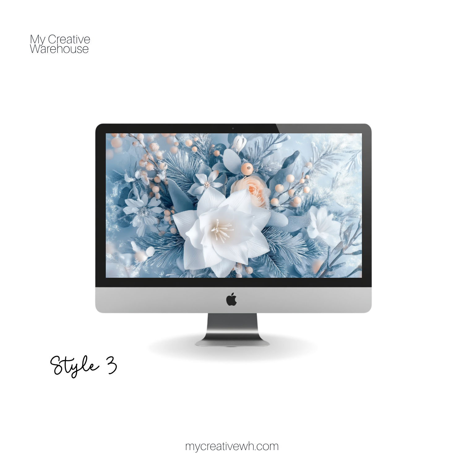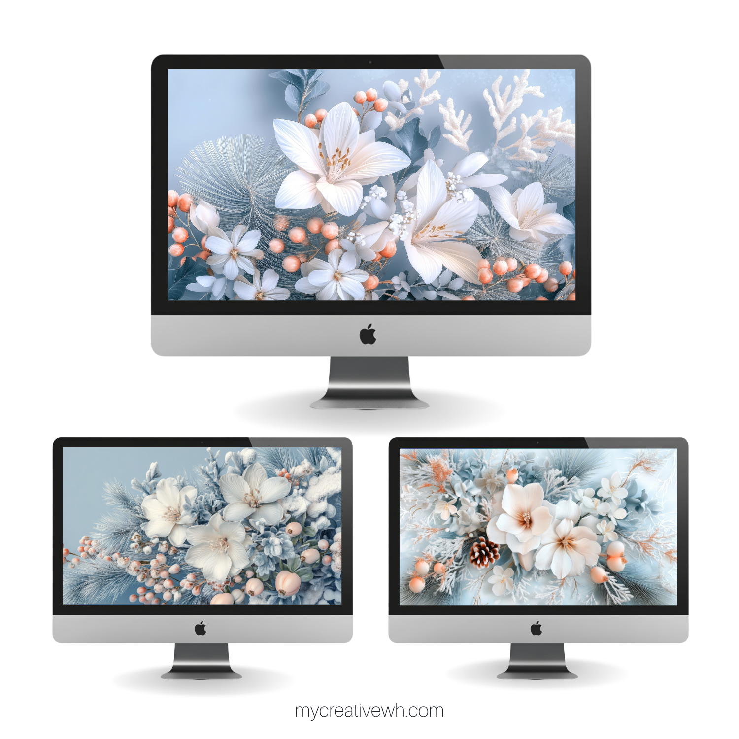 Ideal for dual monitors or minimalist setups, the icy blues and warm peach accents foster focus while adding refined tranquility to working, designing, or casual browsing. Let your desktop radiate frost-kissed elegance anytime of the year.