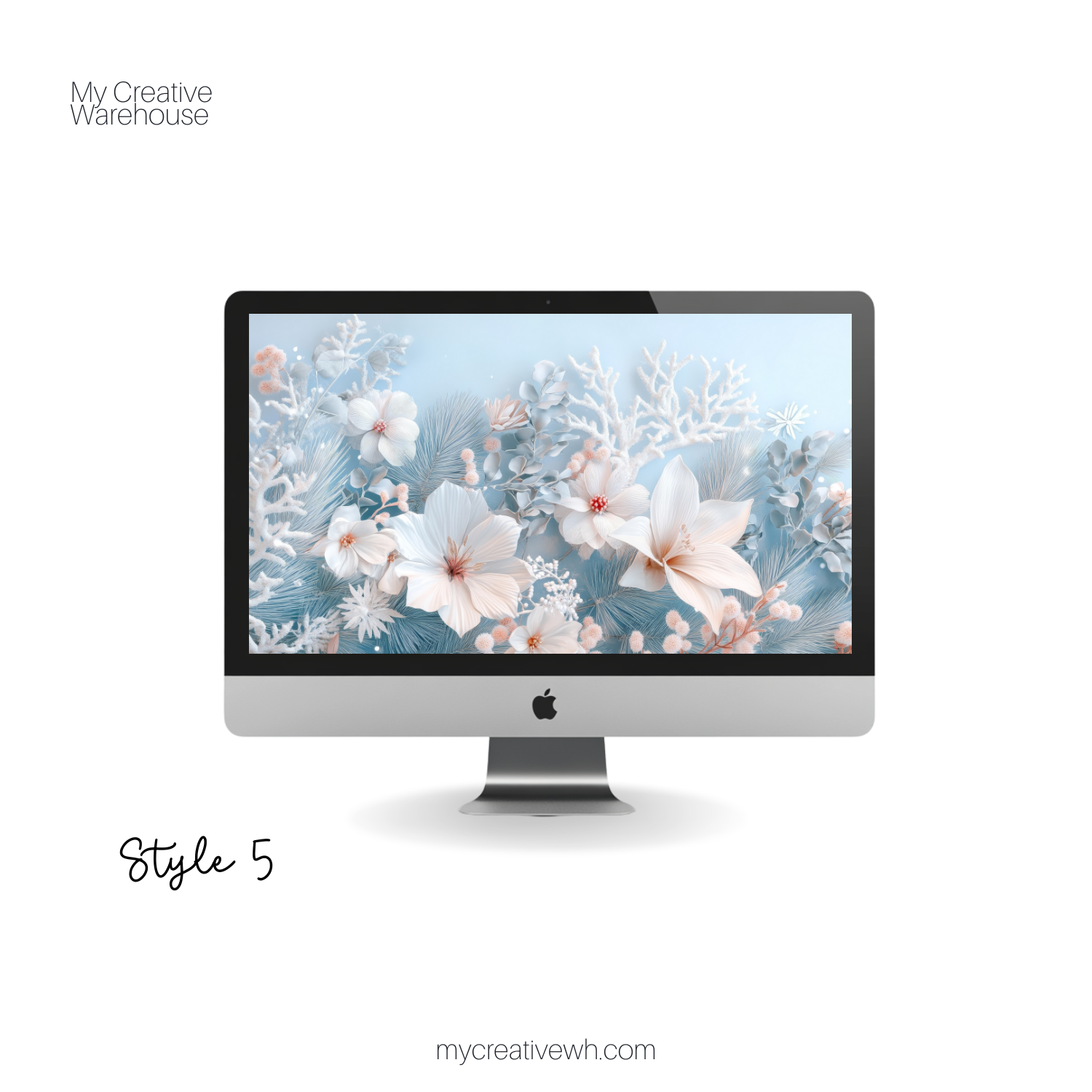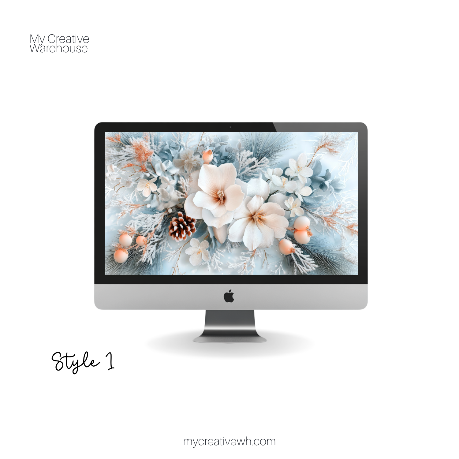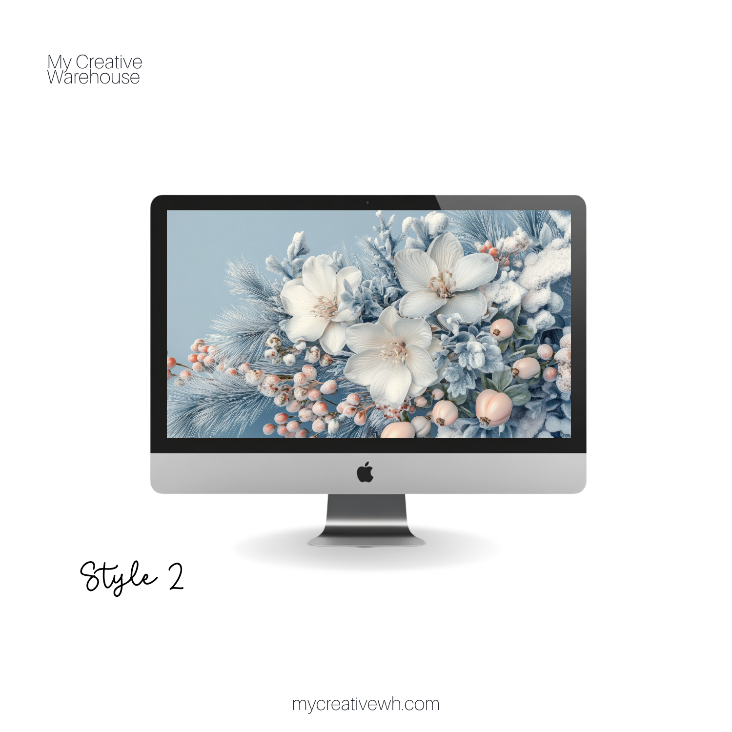 Transform your workspace into a winter sanctuary with the Icy Blue Winter Floral Bouquet Desktop Wallpaper Collection. This set of 5 high-resolution designs stretches across your screen with lush bouquets of amaryllis, hypericum berries, and pine sprigs, set against a backdrop of slate blue, ivory, and pale pink. Subtle snowflakes dust select scenes, evoking the quiet charm of a snow-blanketed landscape.