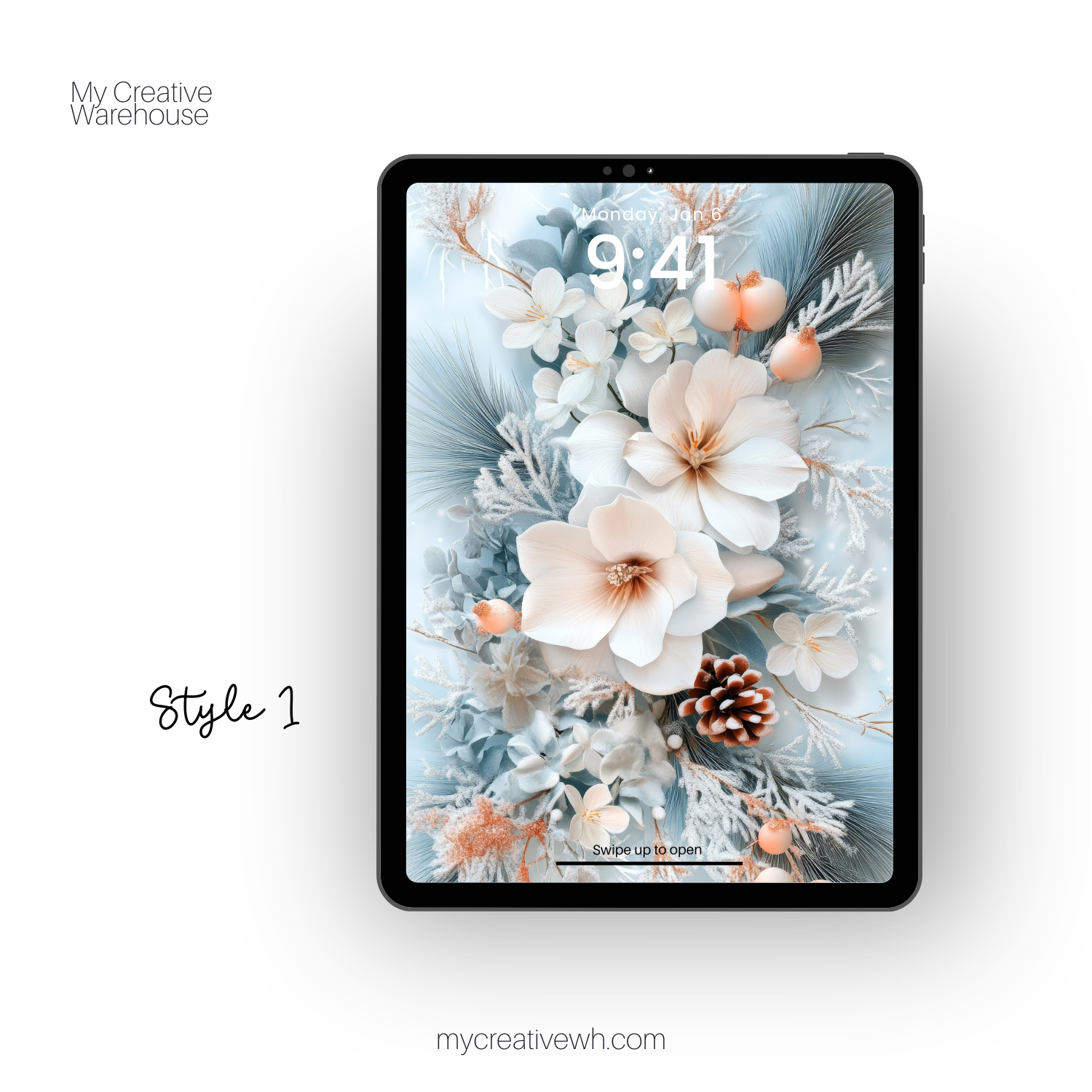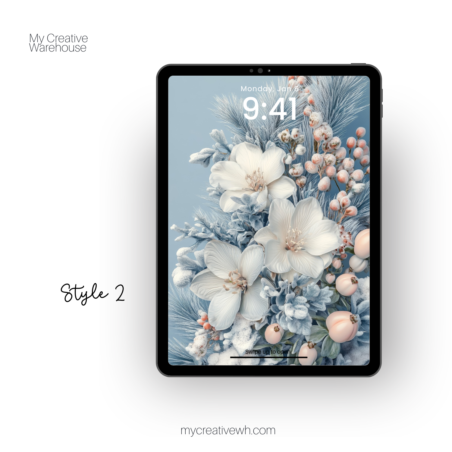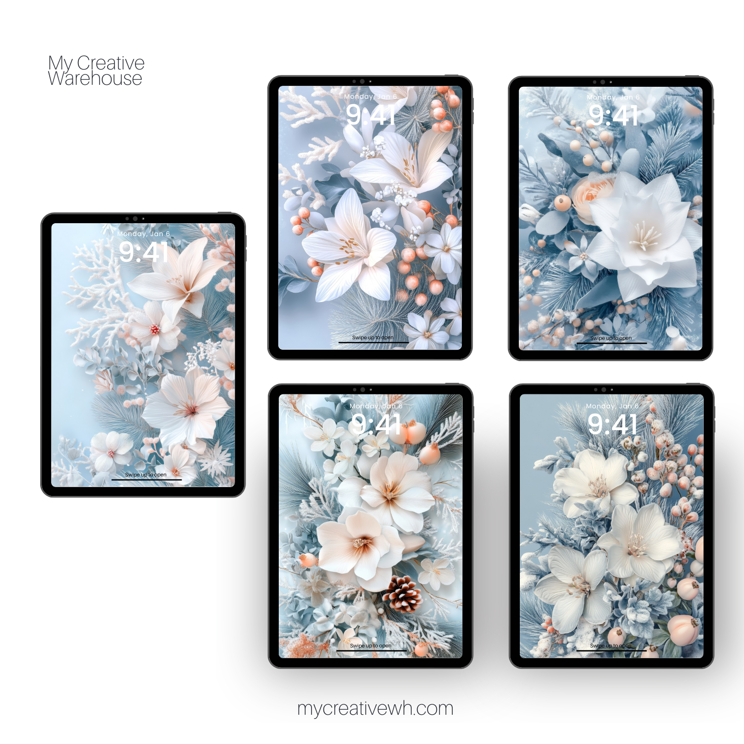 Rendered in slate blue, powder blue, and soft peach tones, these wallpapers capture the crisp elegance of a frost-kissed morning. The iPad’s expansive screen highlights intricate details like hypericum berries and pine sprigs, making them ideal for artists, planners, or anyone seeking a calming backdrop for creativity.