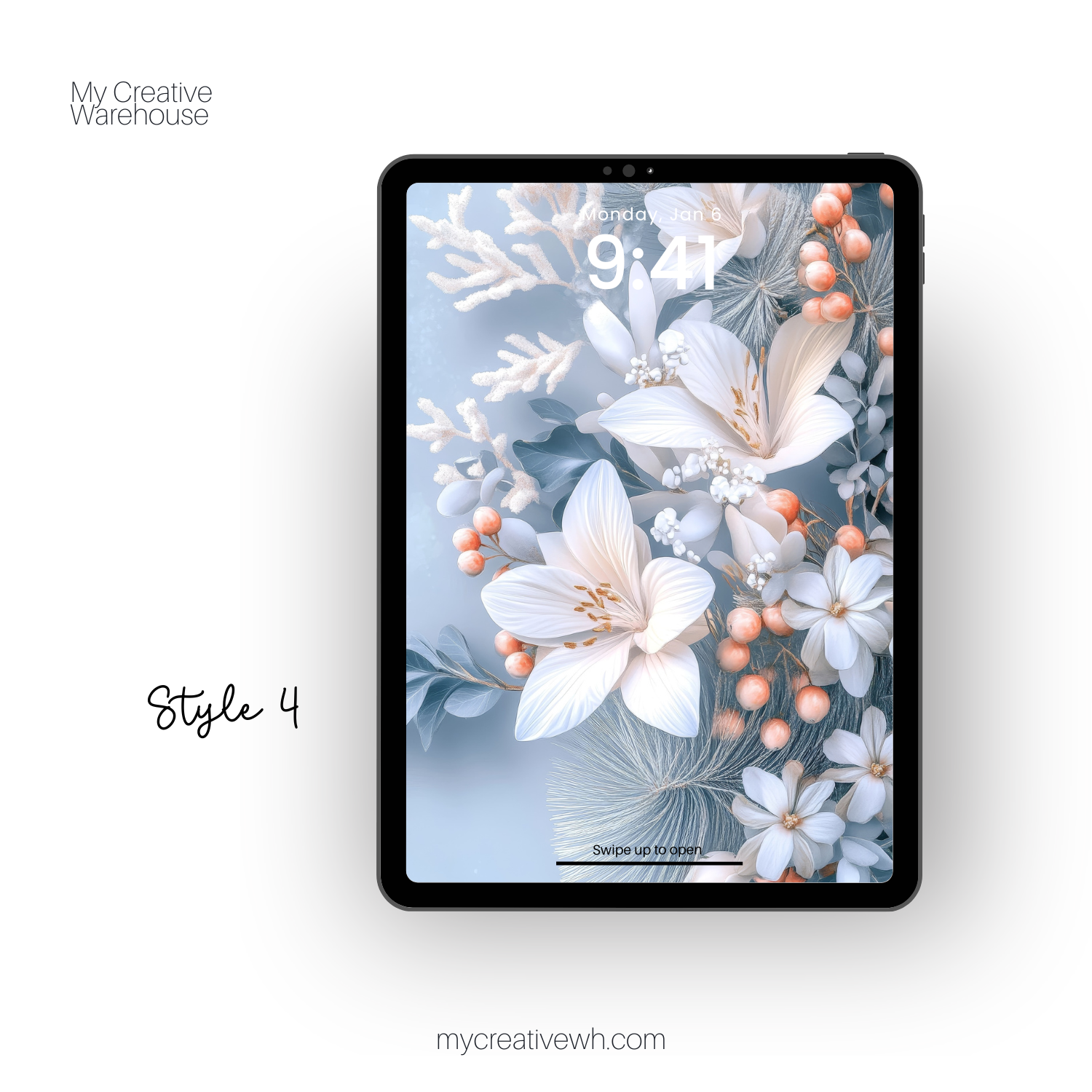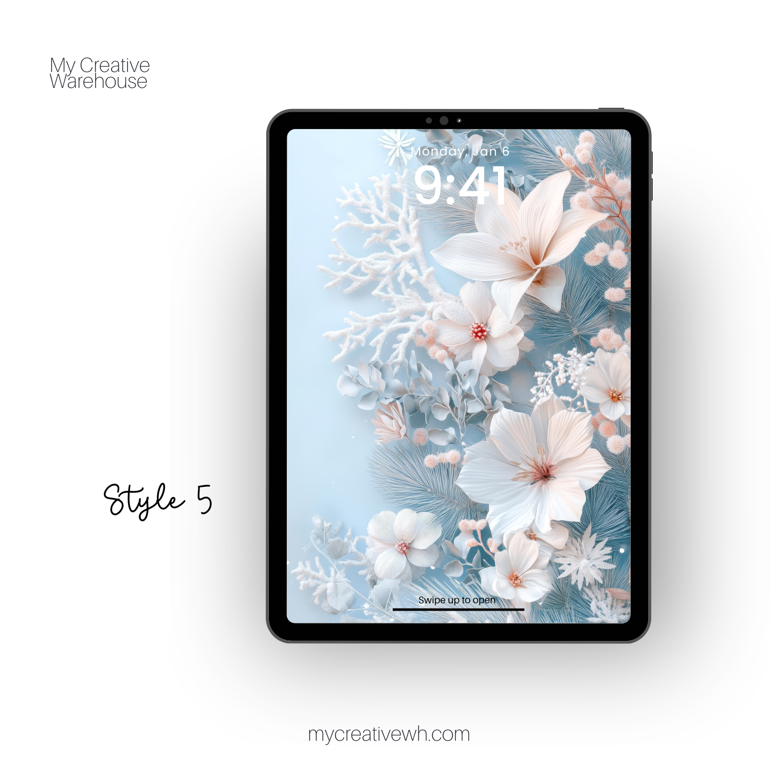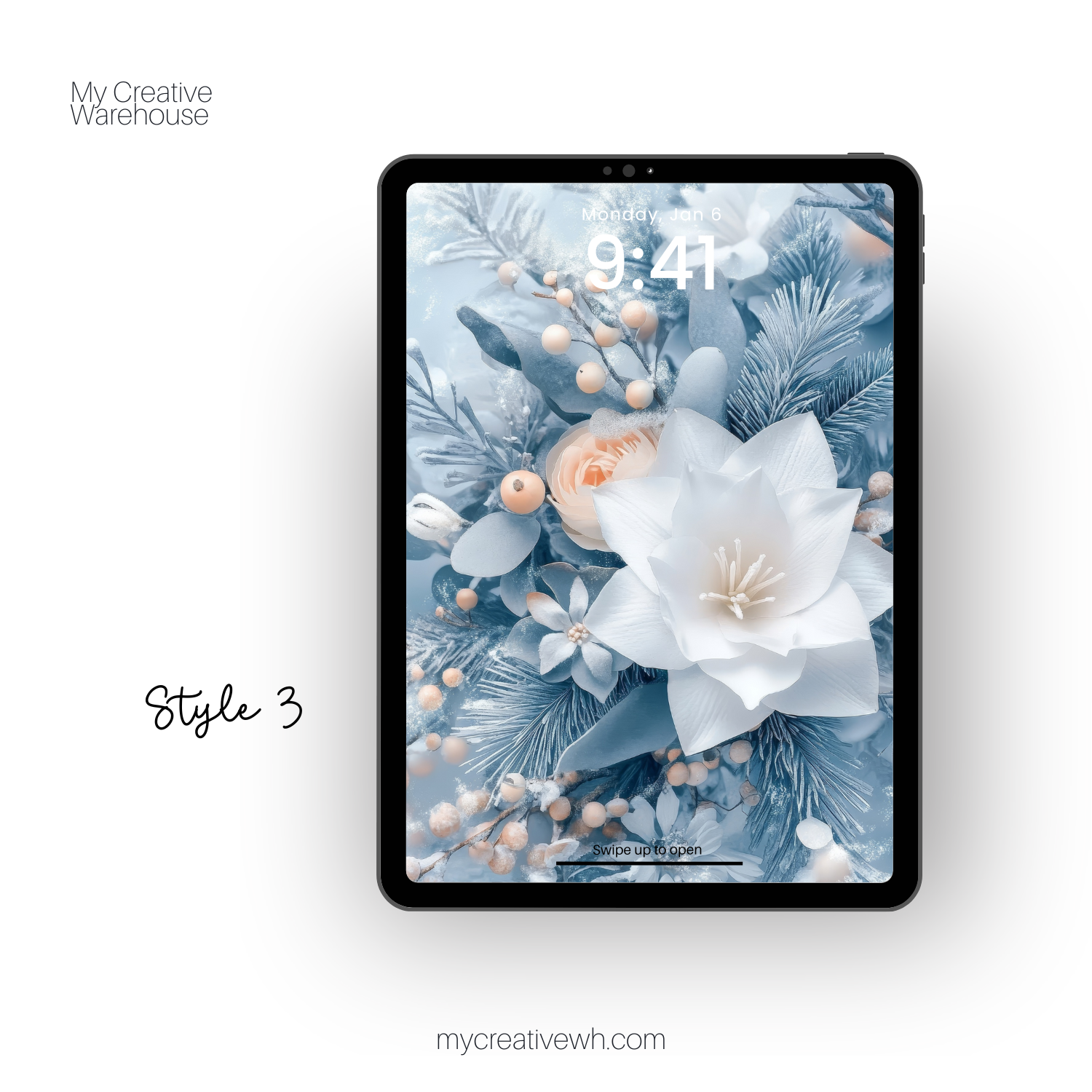 Rendered in slate blue, powder blue, and soft peach tones, these wallpapers capture the crisp elegance of a frost-kissed morning. The iPad’s expansive screen highlights intricate details like hypericum berries and pine sprigs, making them ideal for artists, planners, or anyone seeking a calming backdrop for creativity.