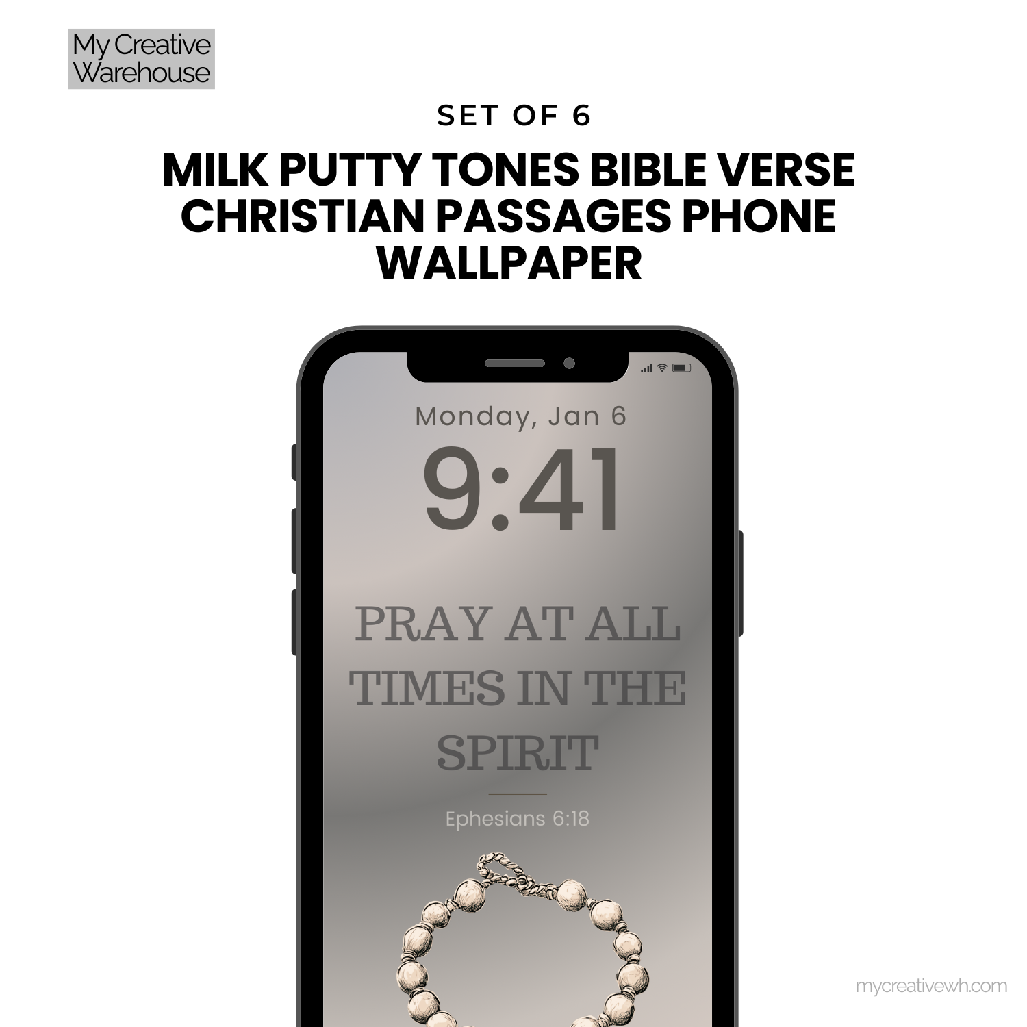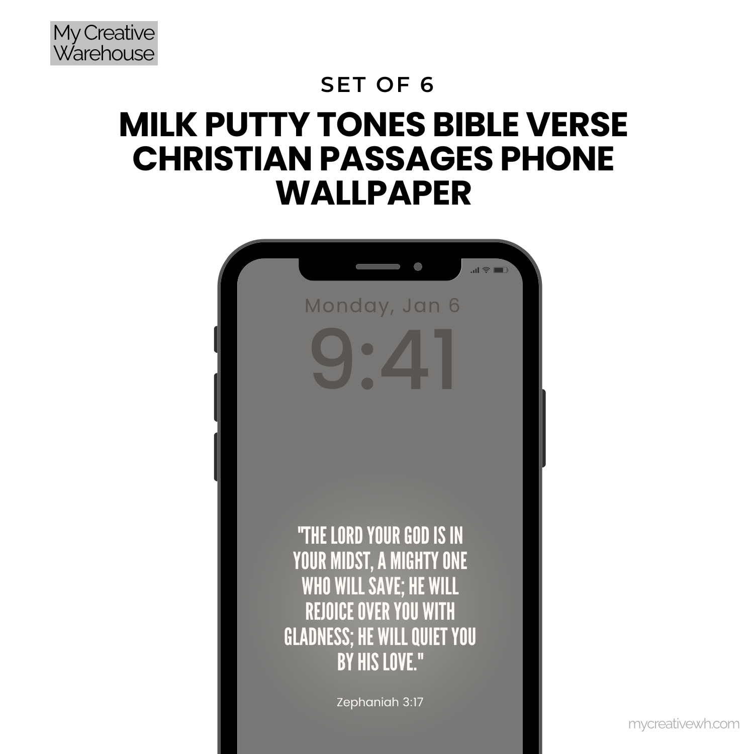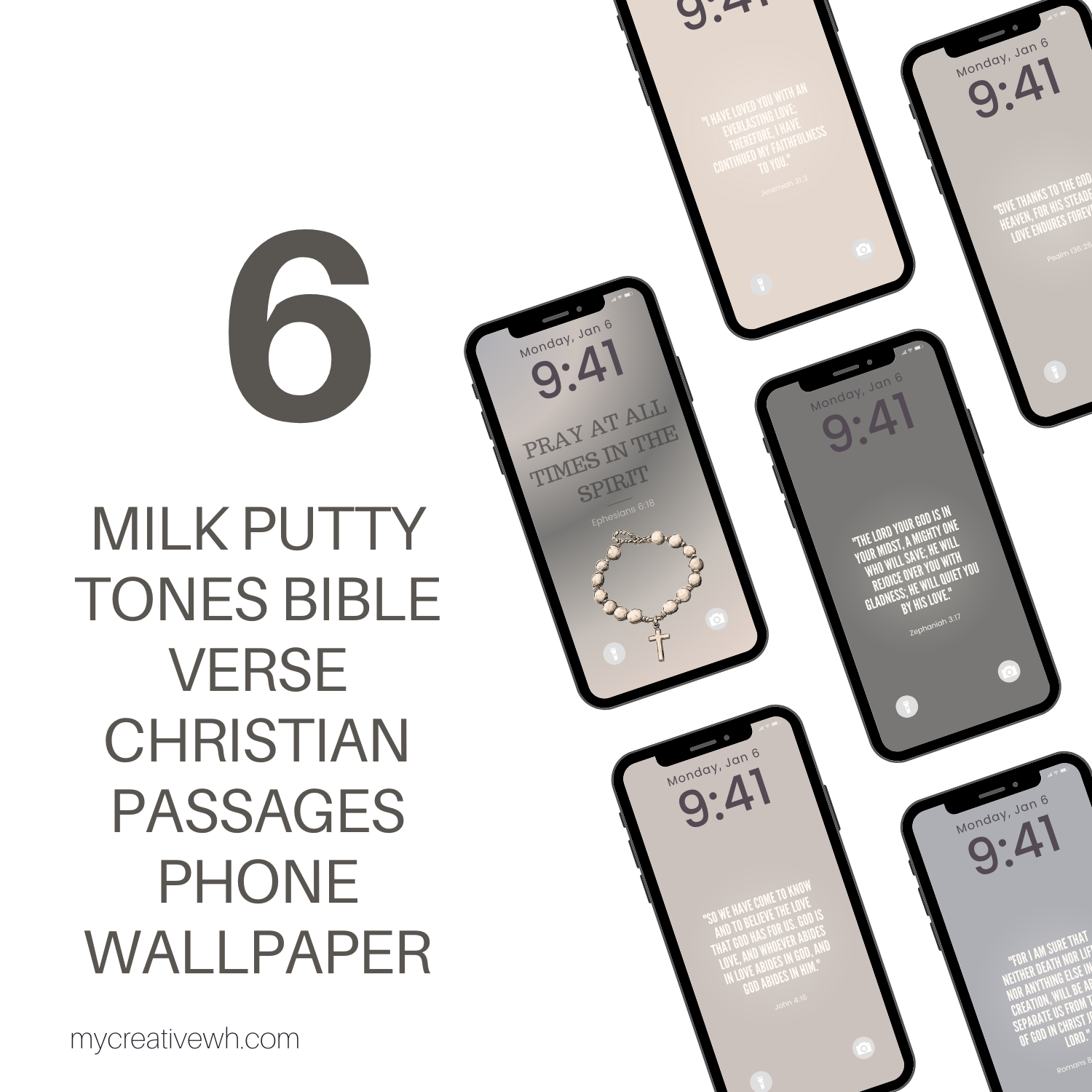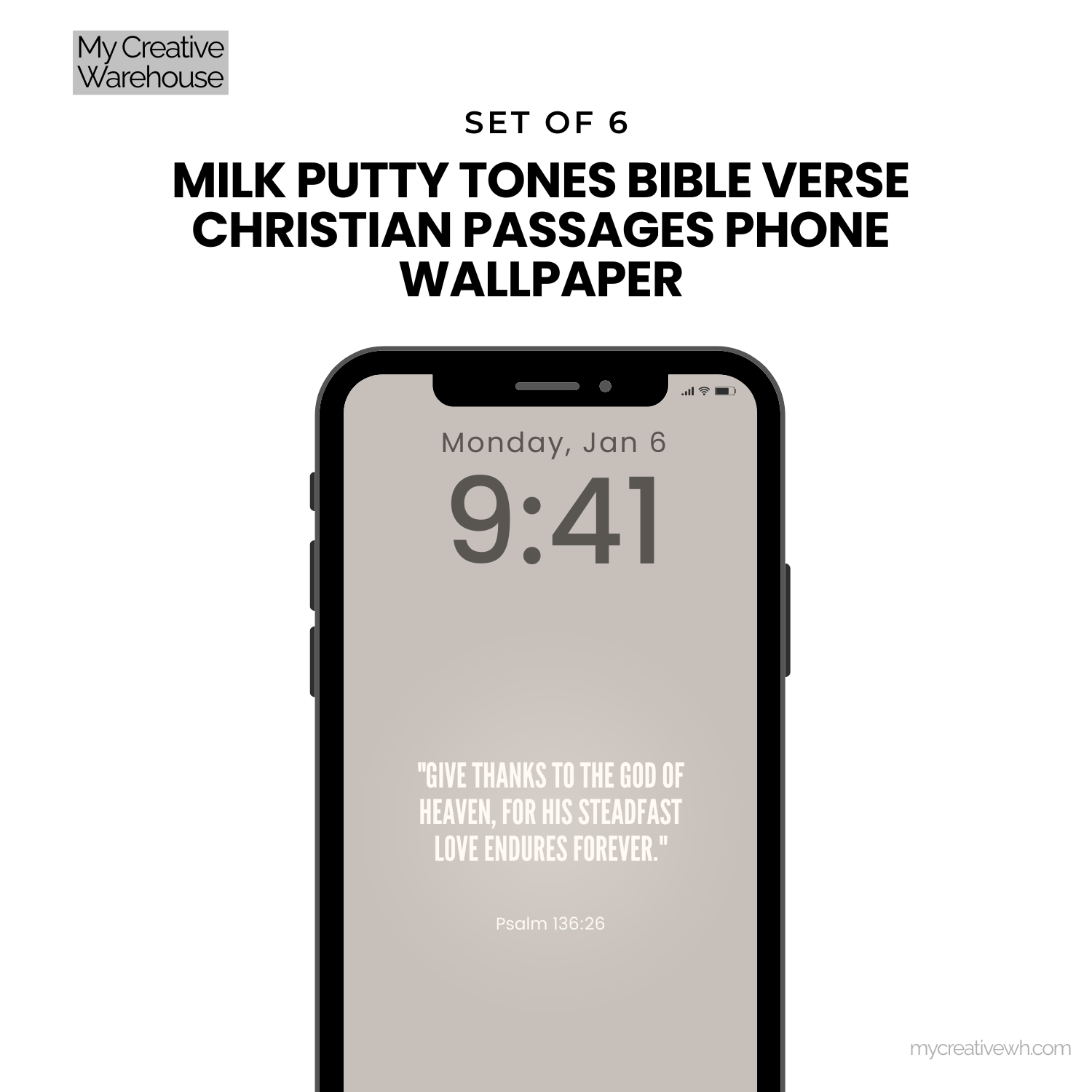 Celebrate subtlety and strength with our Milk Putty Tones Bible Verse Christian Passages Phone Wallpaper Set. This 6-design collection (plus a rosary bonus) features putty grey, taupe, and warm tan hues for a neutral, calming faith aesthetic.