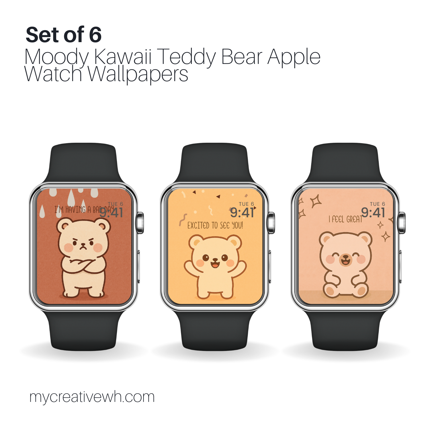 Add a sprinkle of sweet sincerity to your wrist with the Moody Kawaii Teddy Bear Apple Watch Wallpaper Set! This collection of 6 high-resolution designs miniaturizes the beloved Kawaii teddy bear, fitting its big moods and even bigger eyes onto your watch face. Each scene pairs soft earth-toned backdrops with playful doodles, turning every glance into a moment of relatable cuteness.
