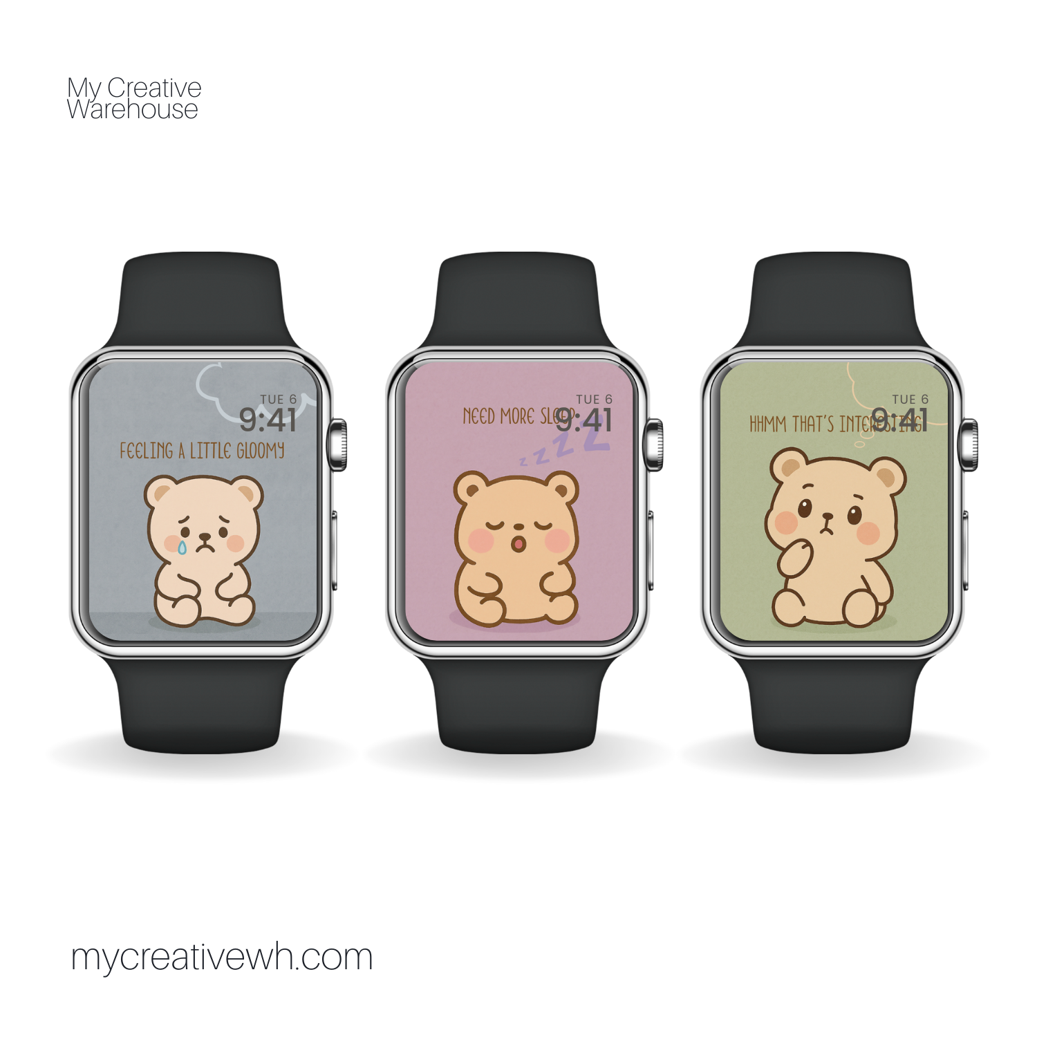 From the sleepy lavender “Need More Sleep” teddy (floating Zzz’s included!) to the peachy “I Feel Great!” bear radiating sunshine, these designs pack personality into every pixel. The “Feeling a Little Gloomy” bear pouts under a tiny raincloud (light slate blue backdrop), while the “Excited to See You!” version beams in pale yellow, surrounded by confetti flecks. The curious sage-green “Hmm, That’s Interesting” bear and the grumpy “I’m Having a Bad Day” companion (muted red-brown raindrops) round out the set.
