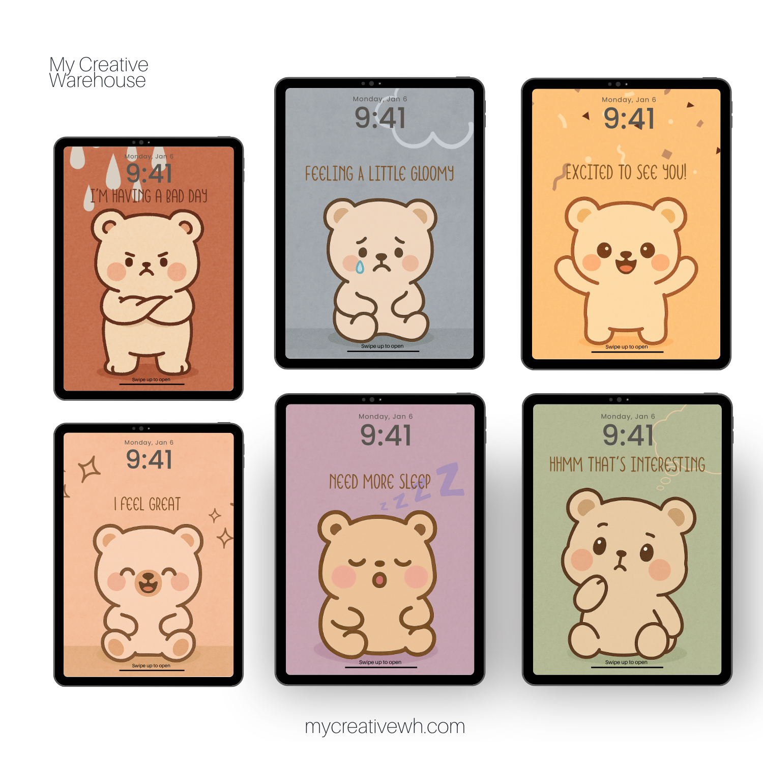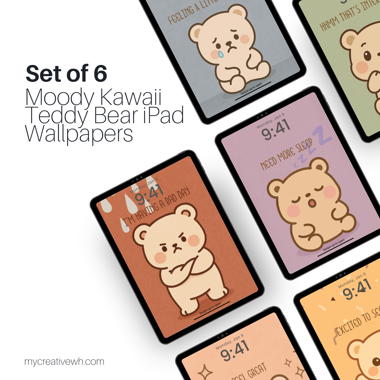 Transform your iPad into a canvas of cozy charm with the Moody Kawaii Teddy Bear iPad Wallpaper Set! This collection of 6 high-resolution designs stars an irresistibly squishable Kawaii teddy bear, each scene capturing a different mood with soft earth tones, whimsical doodles, and heart-melting expressions. Perfect for wearers of hearts on sleeves and lovers of playful, emotive art!