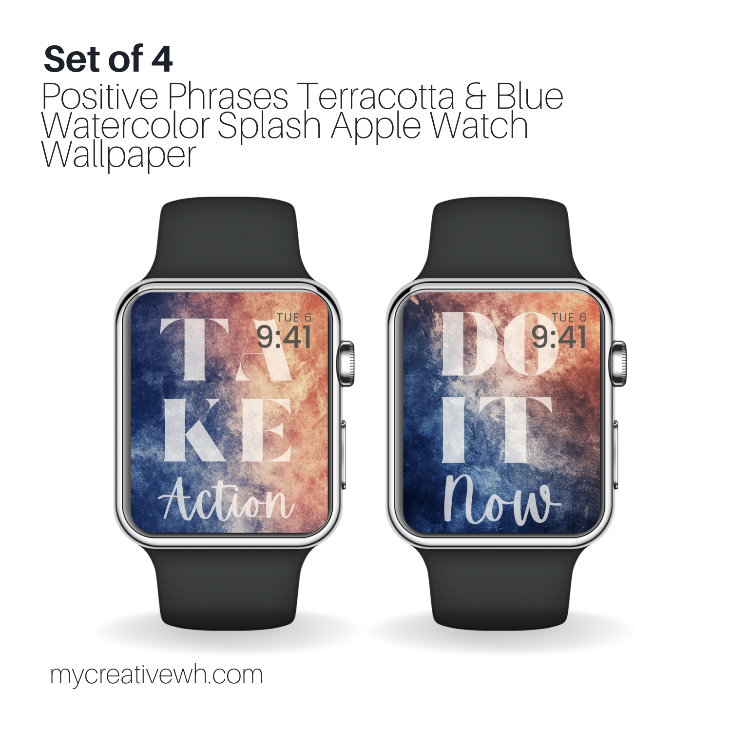 Carry a pocket-sized burst of motivation on your wrist with the Positive Phrases Terracotta and Blue Watercolor Splash Apple Watch Wallpaper Set. These 5 high-resolution designs shrink the vibrant watercolor aesthetic into compact, legible tapestries, pairing distressed terracotta and navy splatters with creamy ivory affirmations like "Love You" and "Take Action."