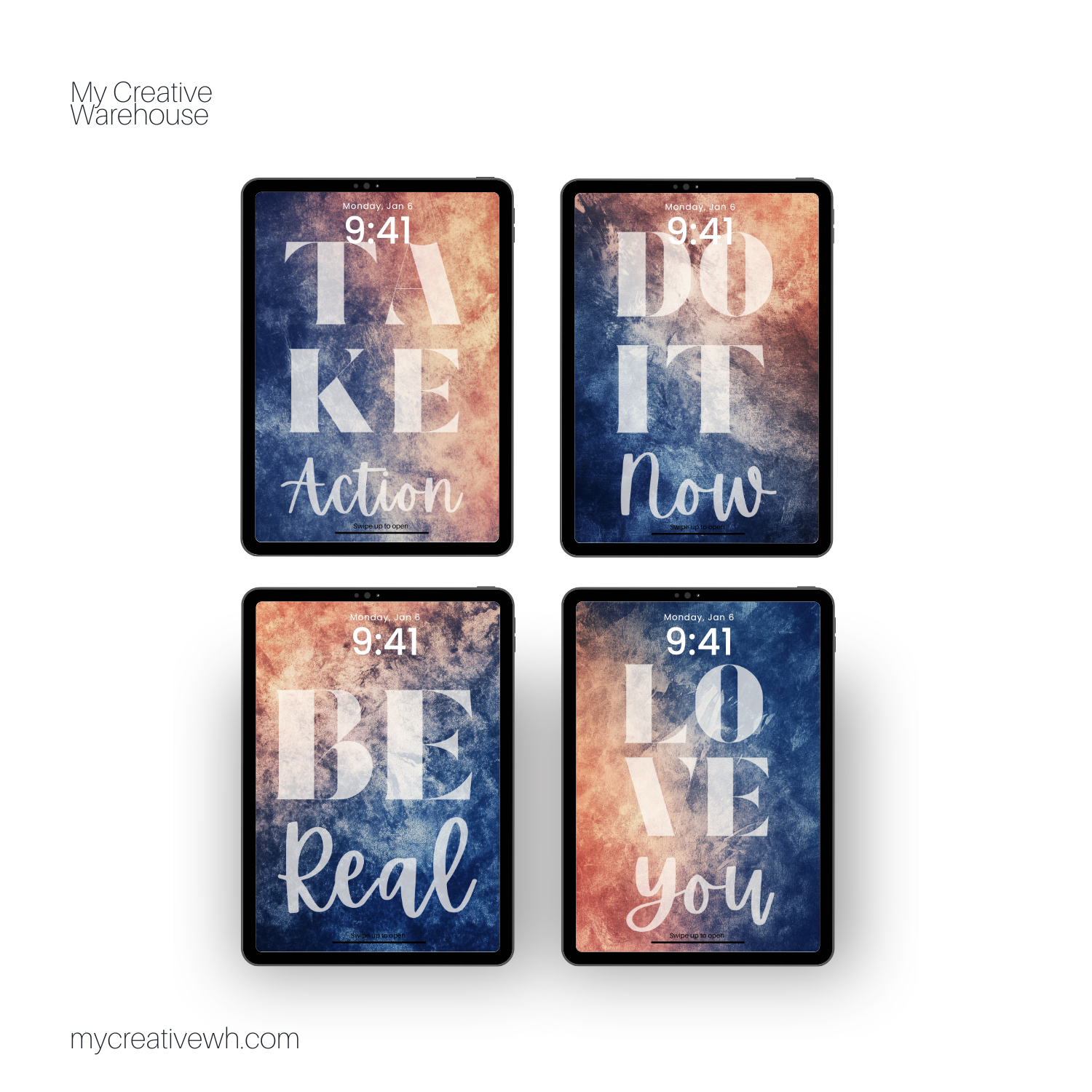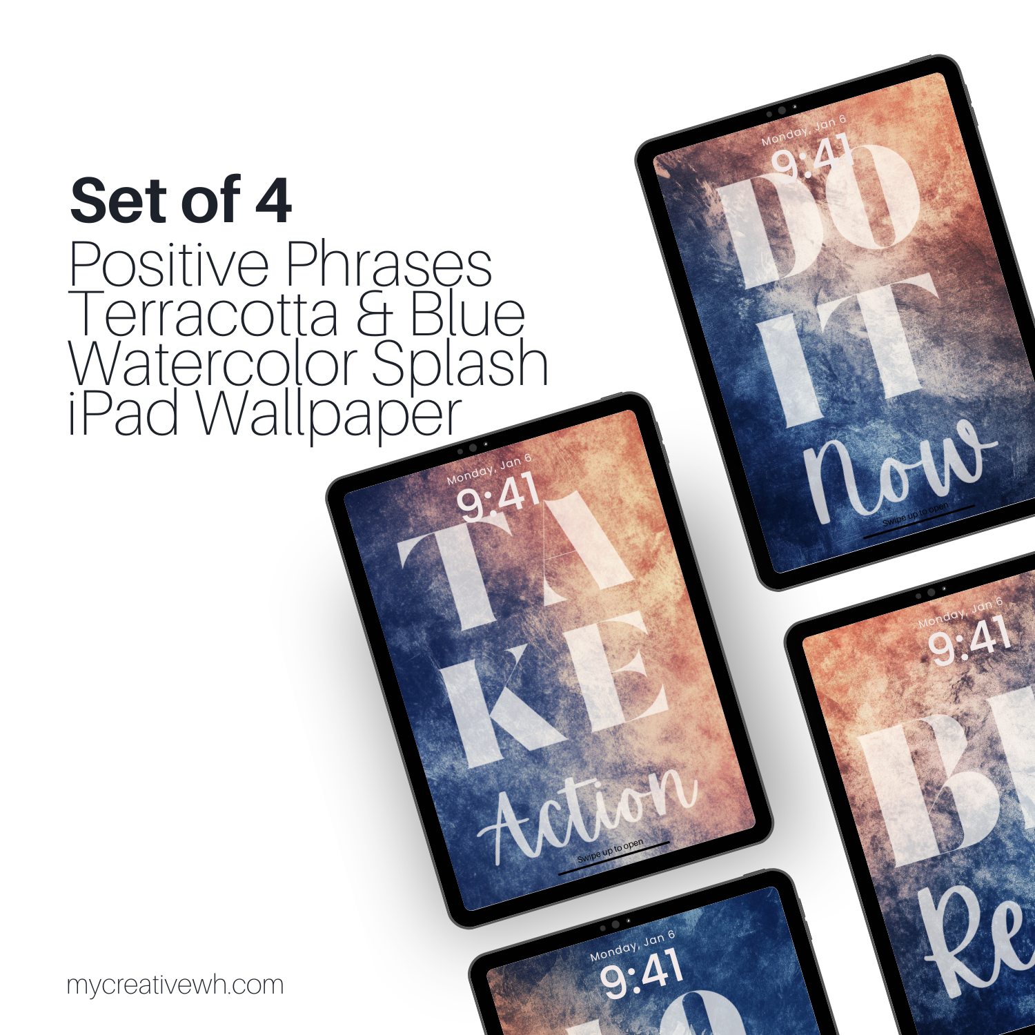 Elevate your tablet’s canvas with the Positive Phrases Terracotta and Blue Watercolor Splash iPad Wallpaper Set—a collection of 5 high-resolution designs blending vintage-inspired watercolor textures with uplifting motivational text. Each wallpaper blends distressed terracotta and navy blue brushstrokes with creamy ivory phrases like "Take Action" and "Love You," creating a harmonious backdrop for creativity, productivity, or tranquil moments.