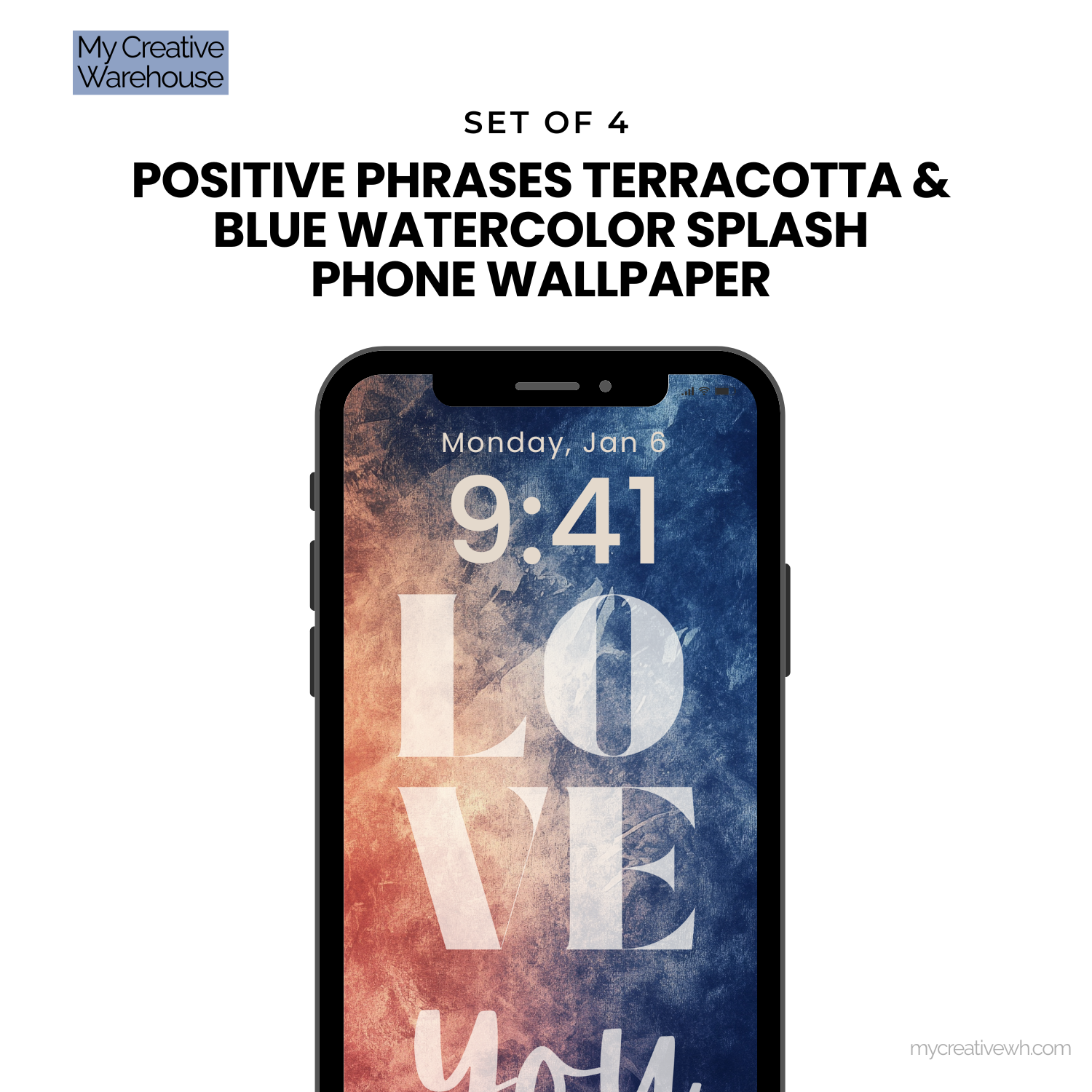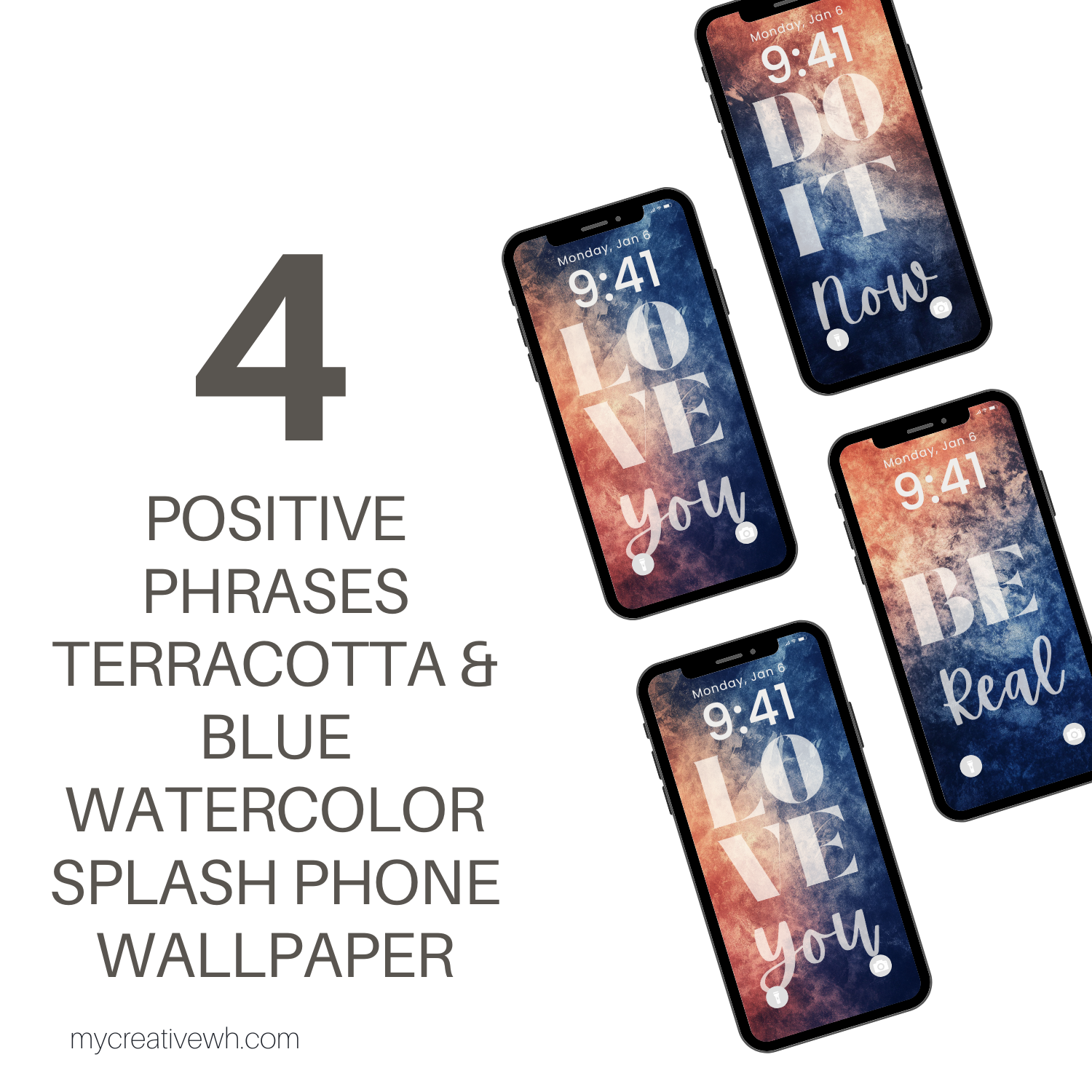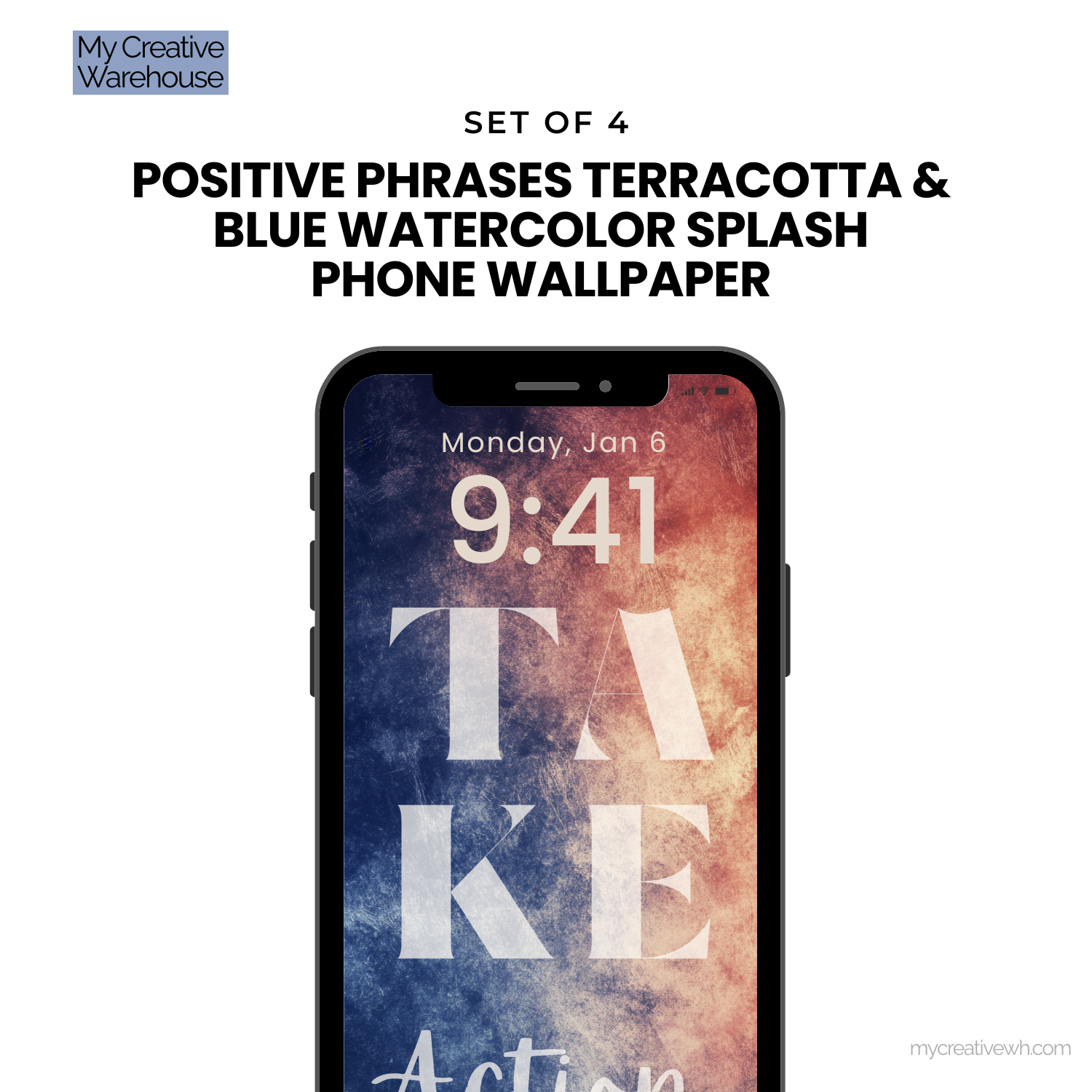 Infuse your device with an empowering blend of creativity and positivity using our Positive Phrases Terracotta & Blue Watercolor Splash Phone Wallpaper Set. This collection of 4 high-resolution designs combines vibrant, abstract watercolor textures in a soothing palette of navy, terracotta, peach, ivory, and mauve with uplifting phrases like "Take Action" and "Love You."
