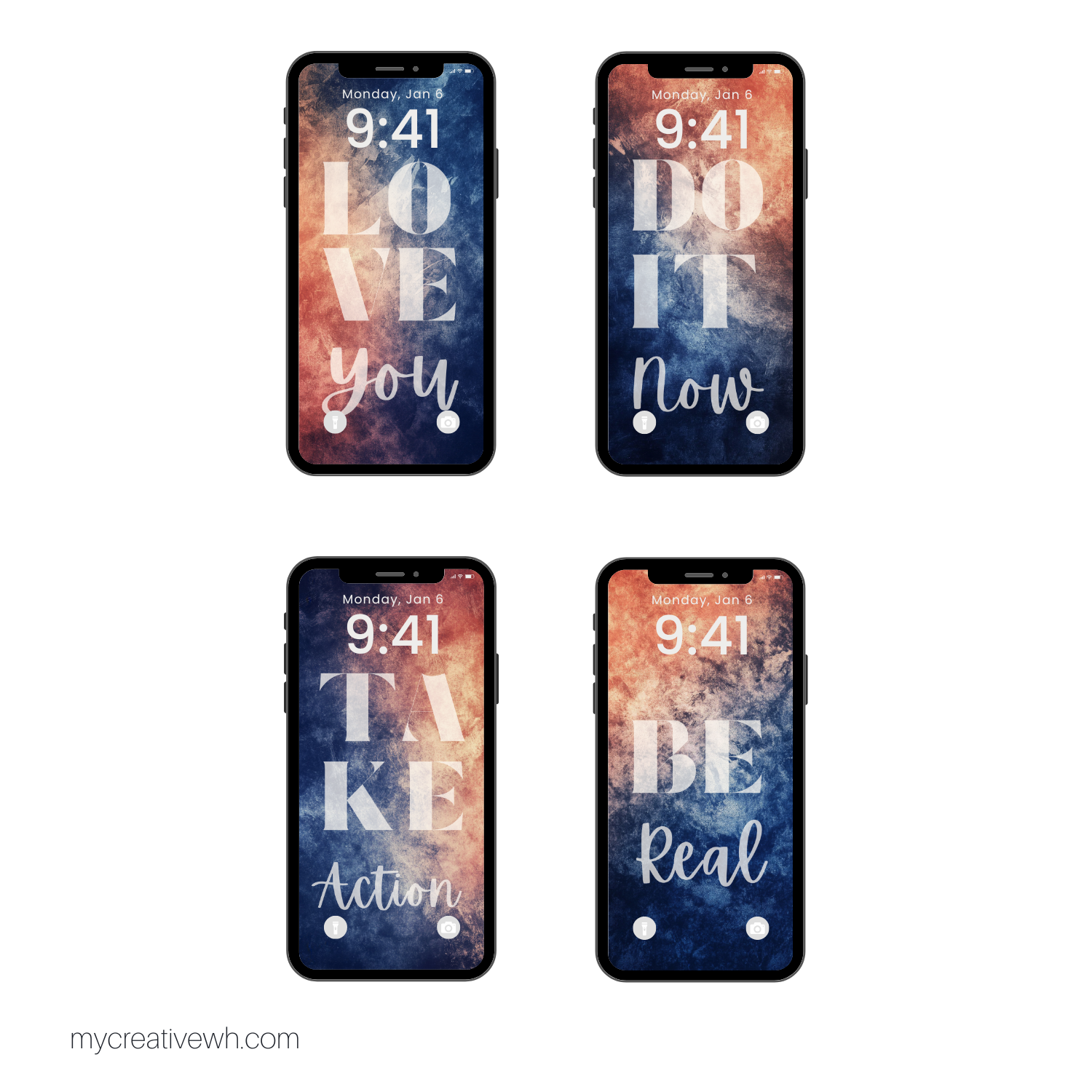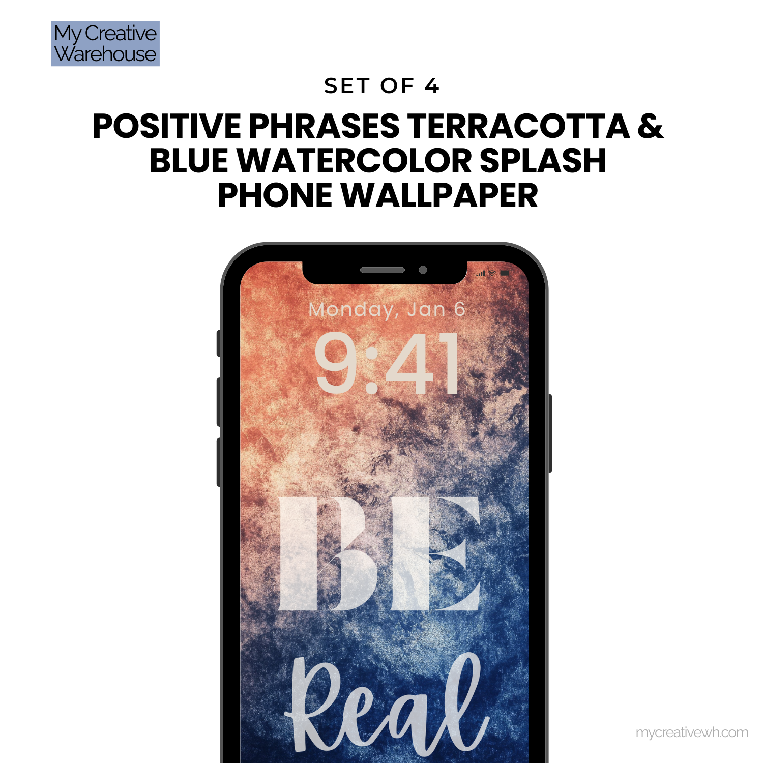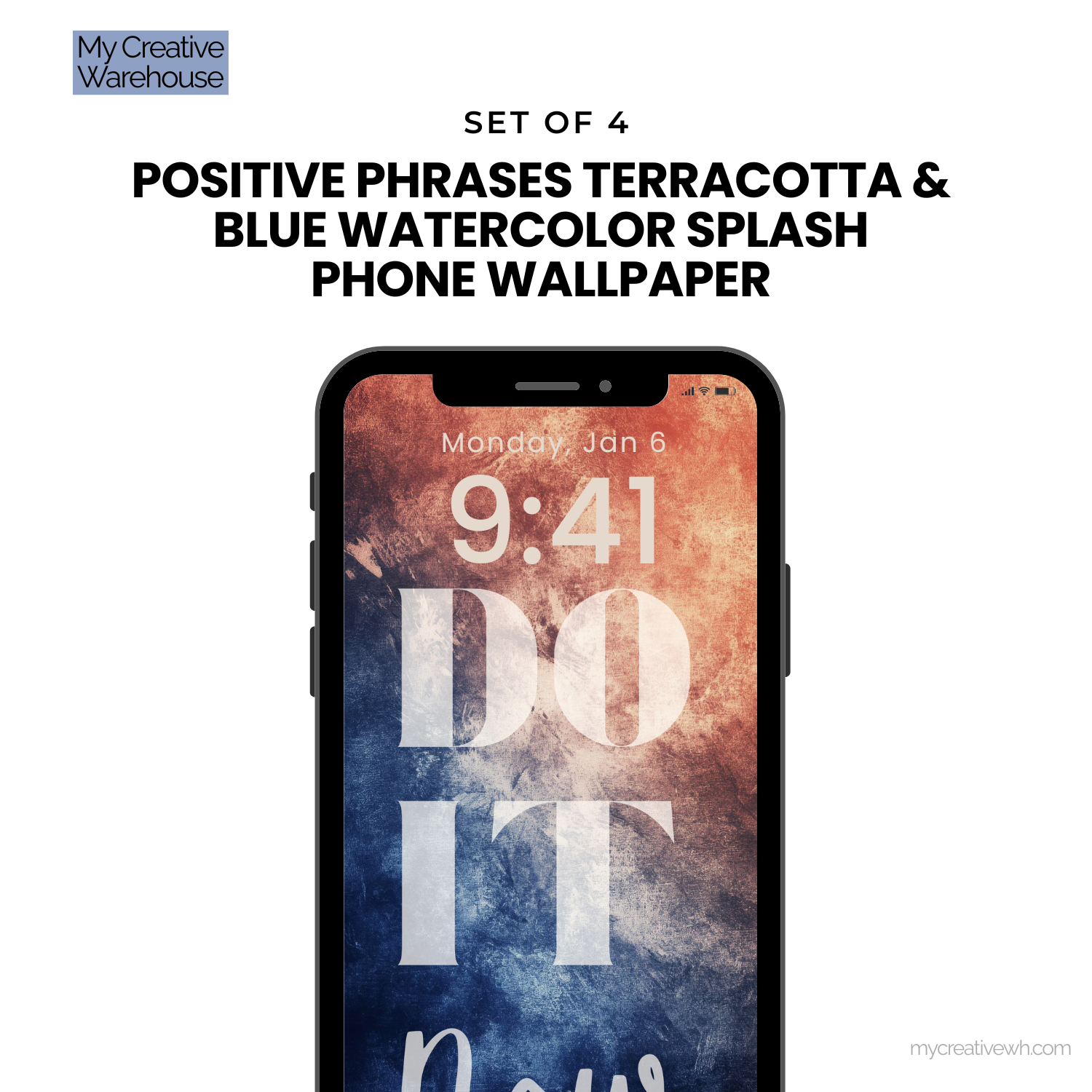 Infuse your device with an empowering blend of creativity and positivity using our Positive Phrases Terracotta & Blue Watercolor Splash Phone Wallpaper Set. This collection of 4 high-resolution designs combines vibrant, abstract watercolor textures in a soothing palette of navy, terracotta, peach, ivory, and mauve with uplifting phrases like "Take Action" and "Love You."