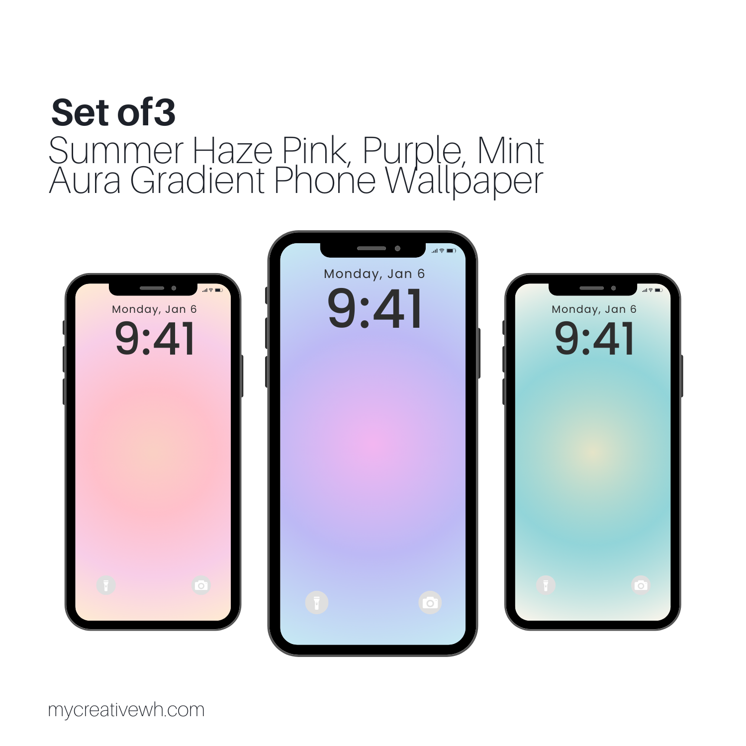 Immerse your smartphone in the sun-kissed serenity of the Summer Haze Pink, Purple, Mint Aura Gradient Phone Wallpaper. This set of 3 high-resolution designs bathes your screen in a trio of citrus-inspired circular radial gradient ombrés, blending peach, coral pink, and lavender; aqua blue, lavender, and baby pink; and peach, light pea green, and teal green. Each gradient mimics the soft glow of a summer sunset, offering a refreshing, light-filled backdrop for calls, apps, or moments of calm.