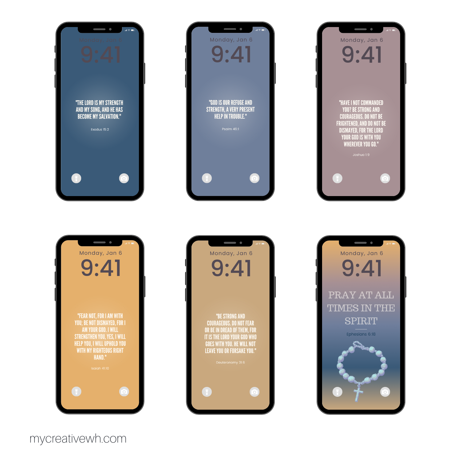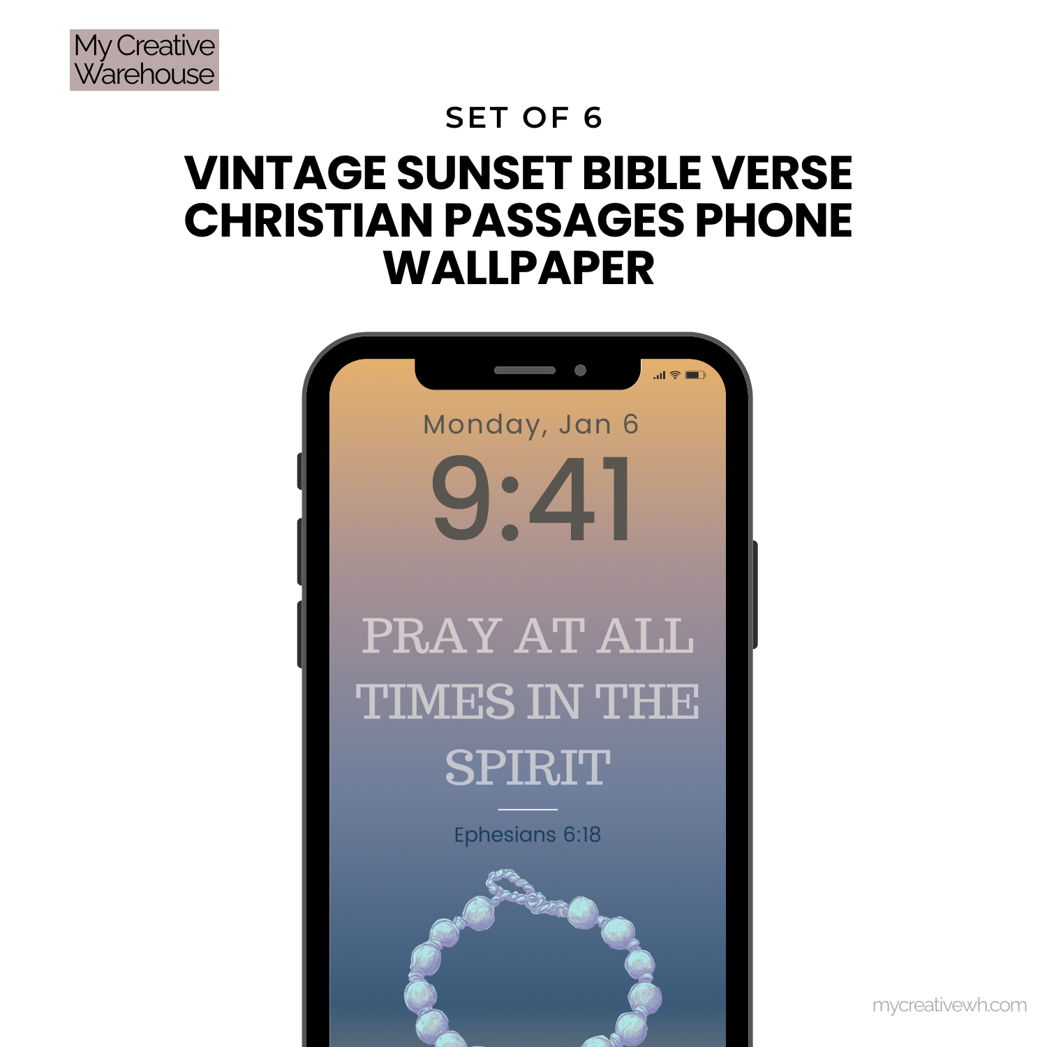 Verses are rendered in crisp detail, against subtle and clean backdrops. The rich, earthy palette creates a contemplative vibe, while the bonus rosary image (“Pray at all times in spirit”) adds a tangible connection to prayerful moments. Ideal for believers drawn to depth and nostalgia.